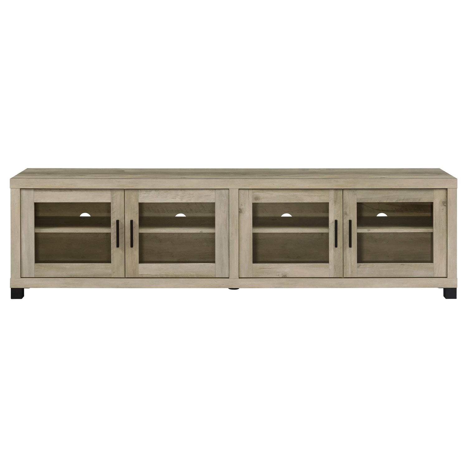The boxy shape and smooth surfaces of this TV console offer a contemporary look and feel to any space. Double cabinet doors, each with glass doors, offer a way to showcase your entertainment setup and operate devices. Behind each door is an adjustable shelf. Adorned on each cabinet door is a slim black pull, mirror ing the black square feet. A long and spacious tabletop surface can support up to an 85-inch television, and offers a grounding furniture piece for wall-mounted TV configurations.