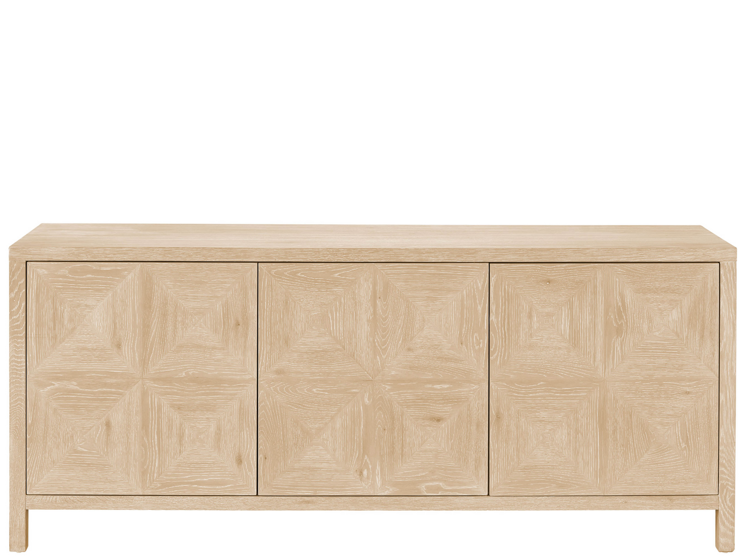 The Sadie Buttermilk Credenza is a credenza constructed from wood that offers organized storage. This furnishing features 4 doors and an encased, subtly etched, geometric-inspired silhouette, bringing character to any room.