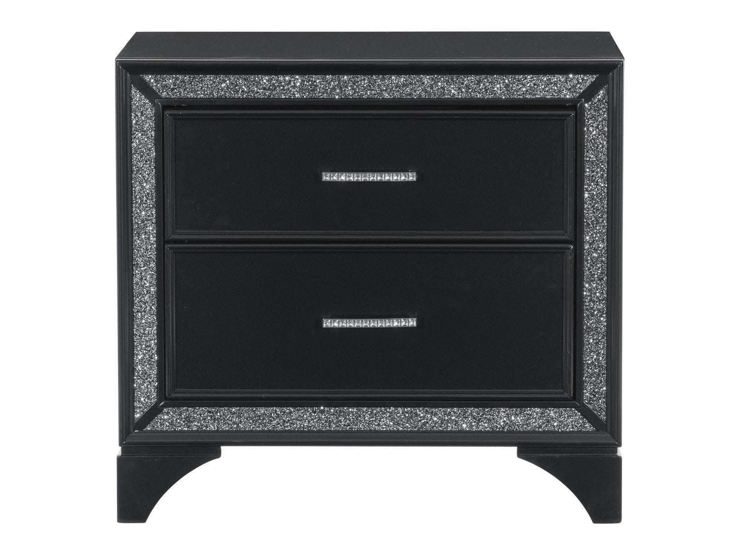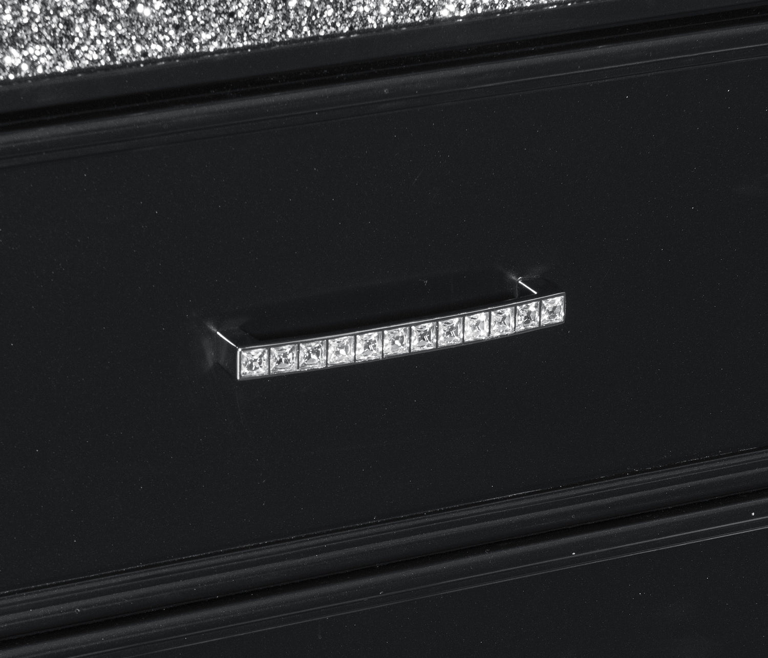 Glamour abounds with the addition of the Salon Collection to your bedroom. The black pearlescent finish is enhanced by the sparkling silver glitter trim that frames the nightstand and the faux-crystal chrome bar hardware pulls that front each drawer.