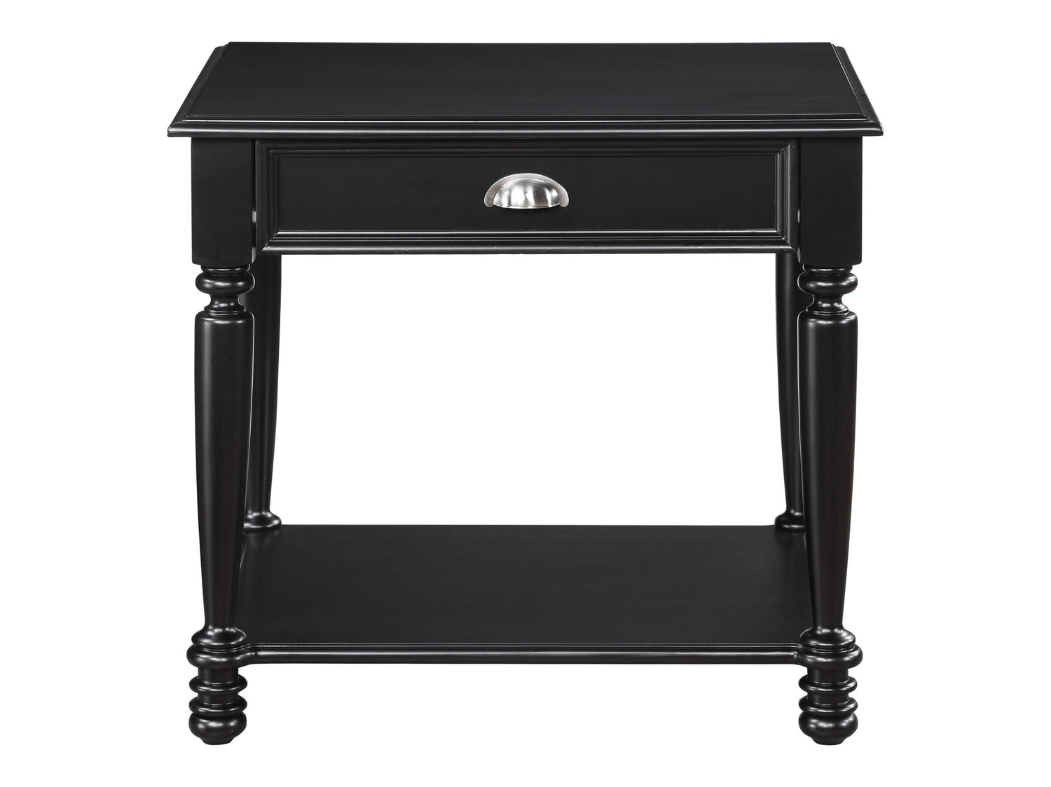 Providing decorative function to your casual traditional living room is the Sanders Collection. The end table has a black finish with traditional accenting of turned legs, cup hardware, display shelf and functional drawer that lend to the classic design.