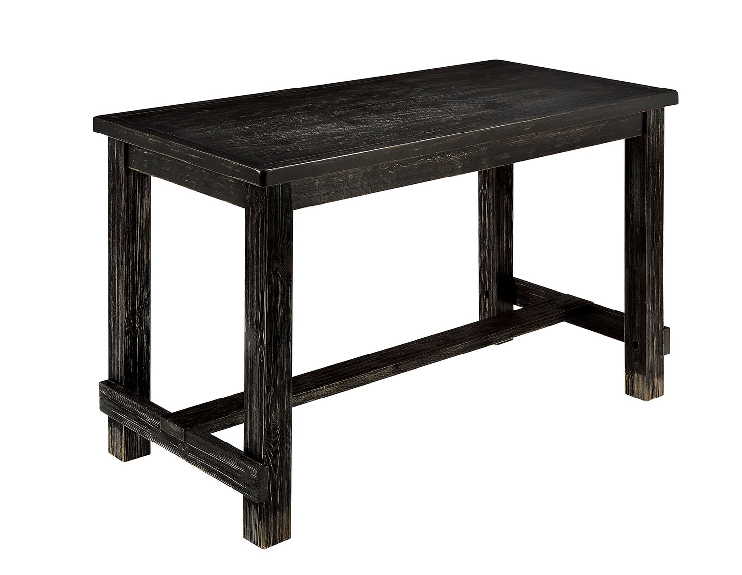 Rustic charm hits its peak with this stunning counter height dining set. The rustic wood grain and distressed black finish take you to a charming farmhouse somewhere in the countryside, achieving an inviting, homey atmosphere that will have family and friends coming back for more. Beige linen-like upholstery adds a brightening effect while the seating pieces come adorned with nailhead trim.