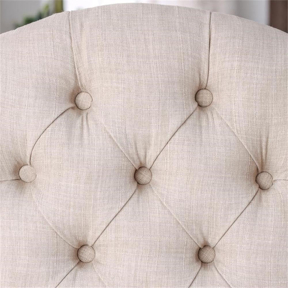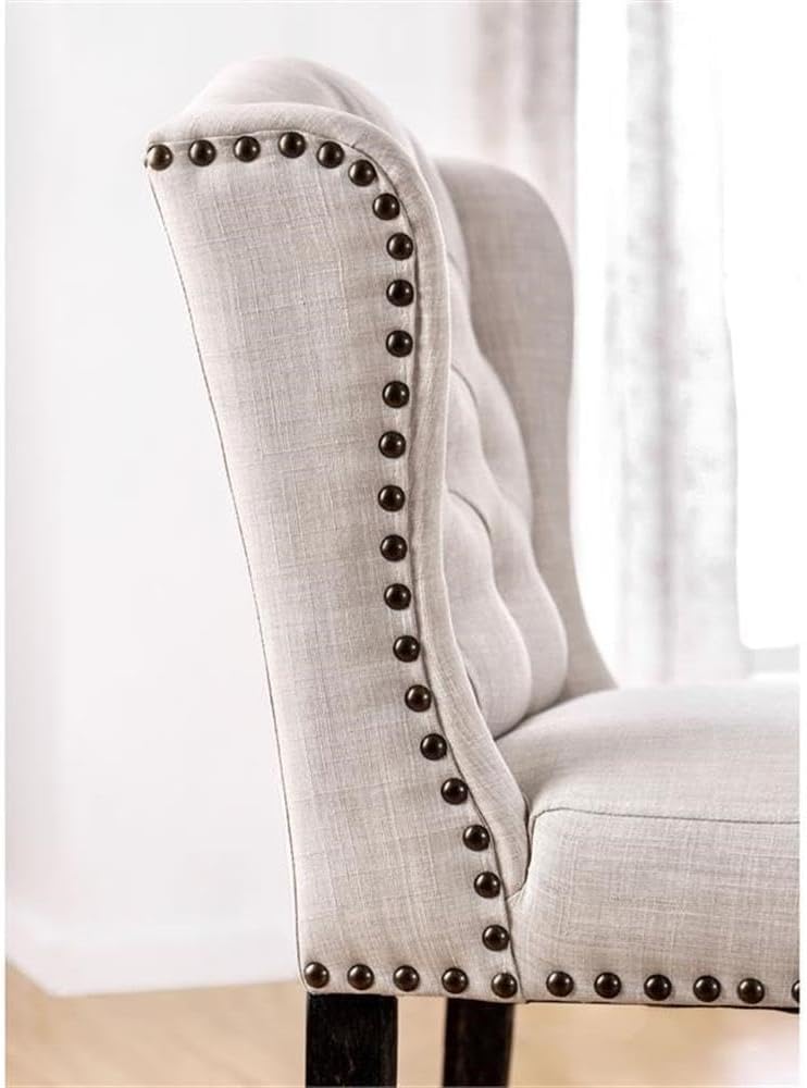 Rustic charm meets upscale design in the form of this stunning collection. The rustic wood grain and antique black finish take you to a charming farmhouse somewhere in the countryside, achieving an inviting, homey atmosphere that will have family and friends coming back for more. Elegant beige linen-like chairs add sophisticated appeal with their wingback sides, button tufting and nailhead trim.