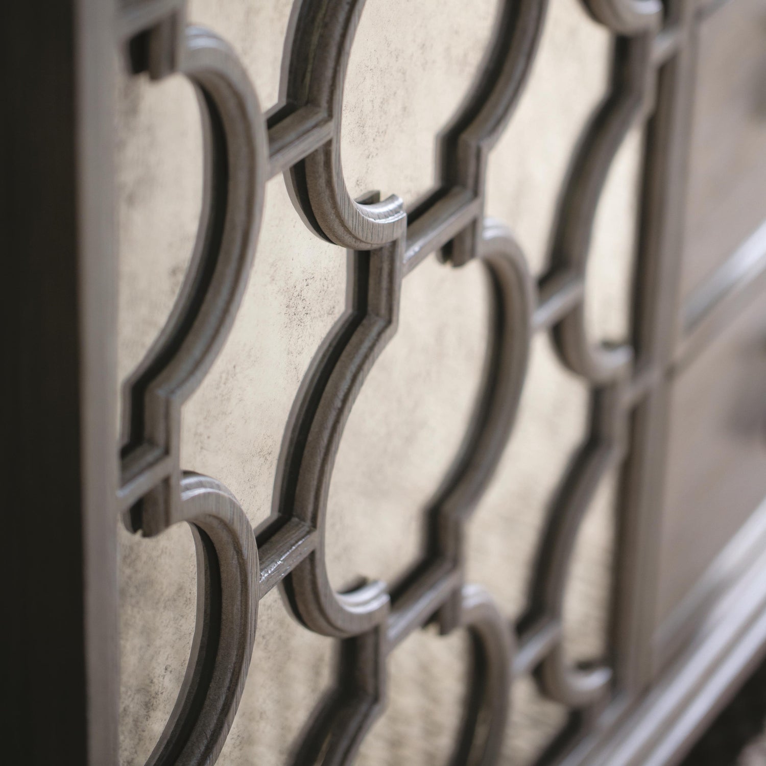 - Two doors with patterned cast grilles over antique glass door front and magnetic catch