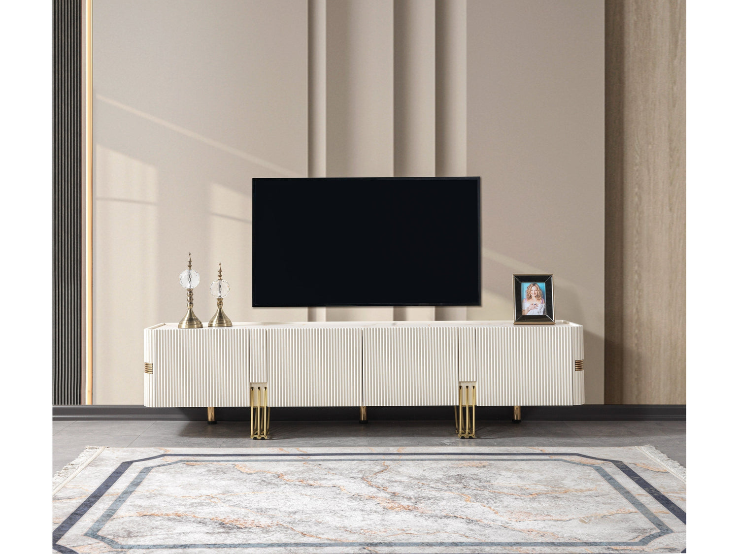 centerpiece that transforms the ambiance of your home. Picture your evenings spent relaxing in a chic, light-filled living room, your favorite series playing on a sleek flat screen perfectly perched atop the stunning ivory-finished cabinetry. The Santana Ivory TV Stand’s gold-toned metallic accents shimmer under warm lighting, while the marble-inspired veneer top captures the essence of modern luxury. Its ribbed textures and clean lines blend seamlessly with both minimalist and glamorous décor styles, making this media console a versatile addition to contemporary, modern, and transitional homes. Whether in a designer loft or a spacious suburban living room, the Santana Ivory TV Stand proves an ideal choice for organizing entertainment essentials in style.