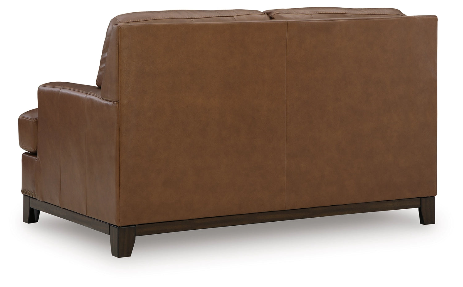Effortlessly blending contemporary and classic elements for a truly timeless look, this loveseat offers a fresh take on transitional style. A robust silhouette is coupled with skillfully matched leather and faux leather upholstery, while nailhead trim adds a touch of subtle sophistication. Pleasingly plump cushions with jumbo stitching provide exceptional comfort. We’re all in—how about you?