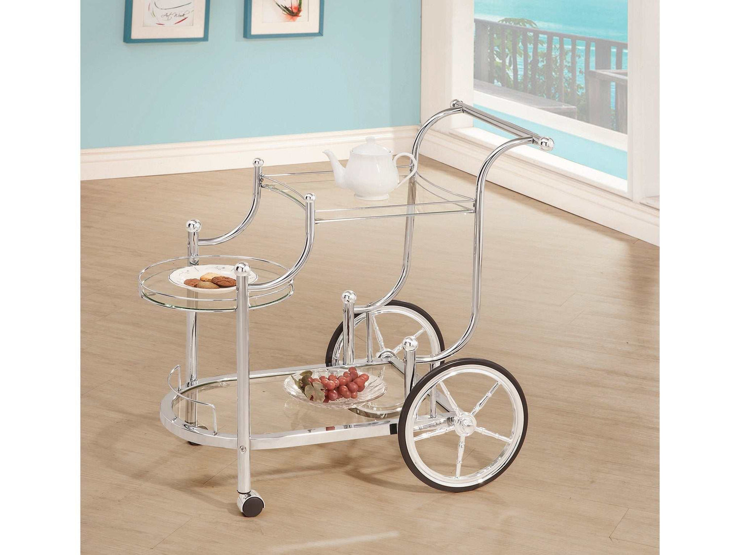 A fun traditional theme offers delightful charm that works perfectly in a traditional or transitional space. This serving cart mimics old fashioned style as it aids in delivering food and spirits to eager guests. Enjoy the captivating look of rustic wheels. Graceful curves create a compelling fluid silhouette on a cart made from metal with finishes in distressed white and chrome. Two tempered glass shelves hold beverages and implements.