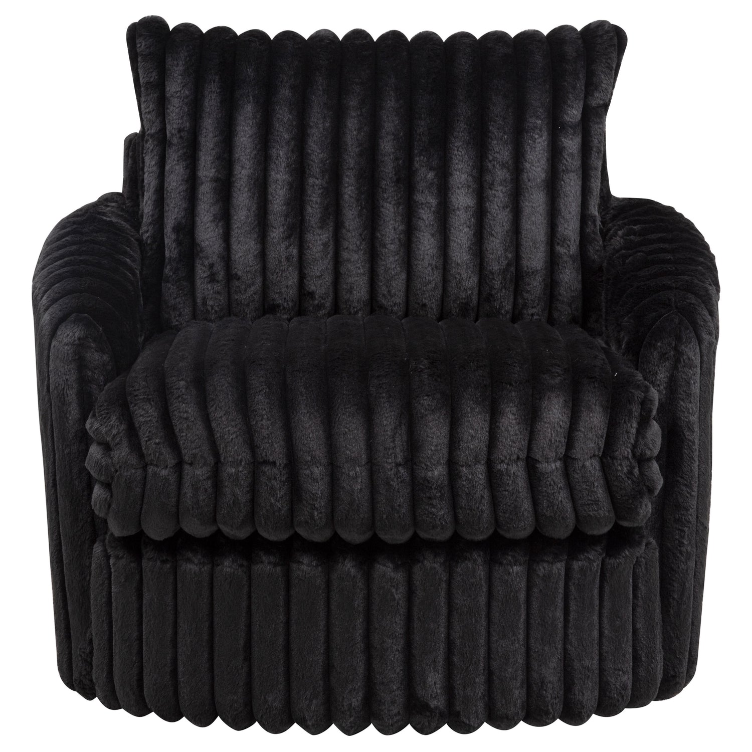- Swivel chair in black corduroy features deep channel tufting and soft sculptural shaping,