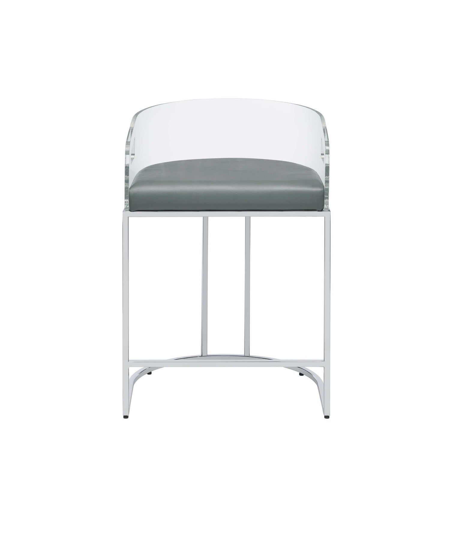 Ultra-modern with a retro-inspired vibe, this pair of stools make a striking piece to a dining room space. With a curved backrest in a clear acrylic material, each stool offers an open and airy design. Rest comfortably on a leatherette cushion as you dine or sip a cocktail. In addition, each stool is supported by a slim metal legs in a lustrous chrome finish and a base shape that mimics the rounded acrylic backrest. Pull up a pair of these stools to a kitchen bar or complete a compact home bar.