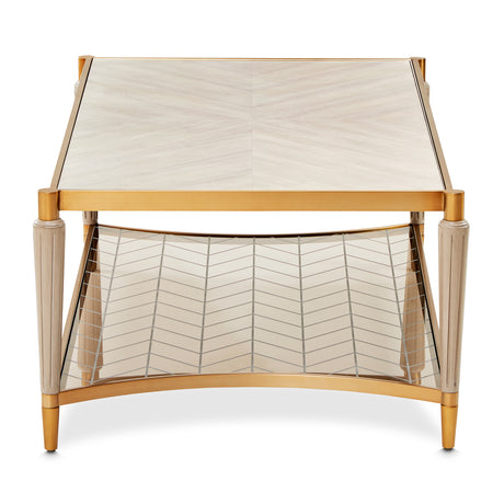 The Savannah Breeze Short Cocktail Table adds refined style and versatility to your living space. Designed as a sophisticated pair, the tables feature beveled glass tops offering a polished, elegant surface. A mirrored bottom shelf provides both functionality and a touch of glamour, perfect for displaying decor or keeping essentials close at hand. Framed in radiant gold, these tables can be used separately or combined with their larger counterparts to create a tailored centerpiece for your room.