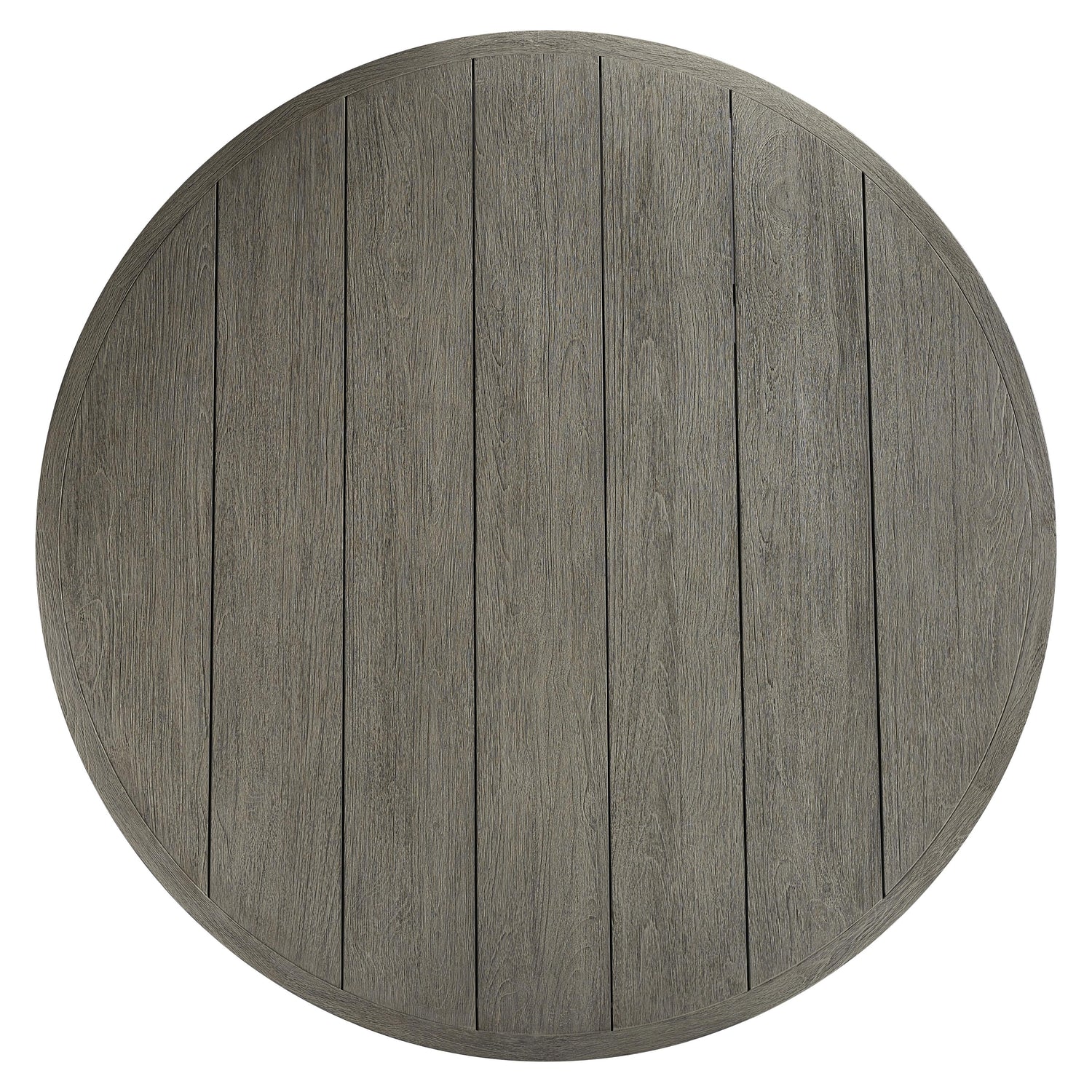 - Teak, plank-look table top in Weathered Teak finish and chiseled glass-reinforced pedestal base in rough Textured Quarry finish