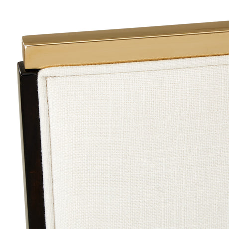 Graceful and refined, the Scotts Square Dining Side Chair brings modern sophistication to your dining experience. Upholstered in a plush chenille fabric in an understated cornsilk hue, it offers an invitingly soft texture with a luminous presence. The sculpted frame, crafted in a radiant gold finish with solid rubberwood legs, adds a stunning contrast of warmth and glamour. A gold metal and mother of pearl accent graces the back, adding a luminous finishing detail that elevates any dining setting.