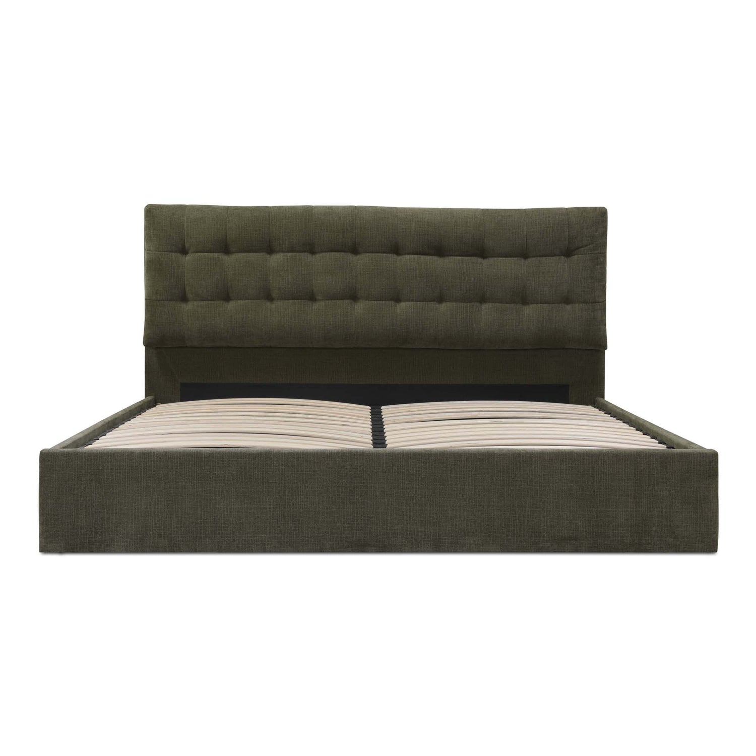 - Pillow-like double-layered headboard with tufted second layer & hydraulic lift storage