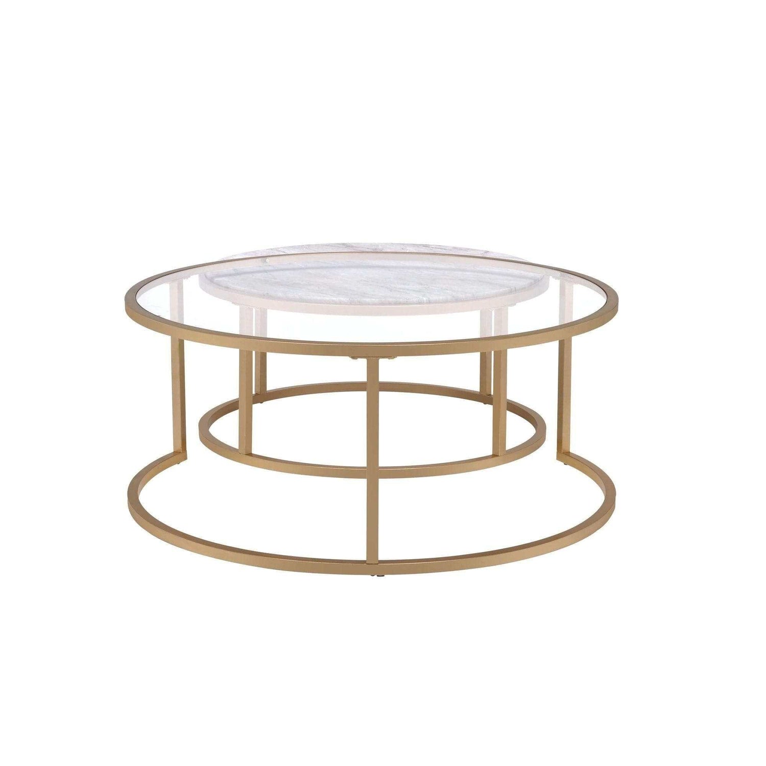 Entertain in style with the Shanish Coffee Table Set. This distinctive two-piece occasional table set showcases intertwining tables with a gold-finished metal base that nestles together or can separate for additional entertainment and display space. This unique round coffee table set features one large table with a glass top and a smaller table with a faux marble top and is a must-have accent piece for your home. Use it to add a touch of contemporary flair to a traditional space or to simply complete a modern aesthetic.