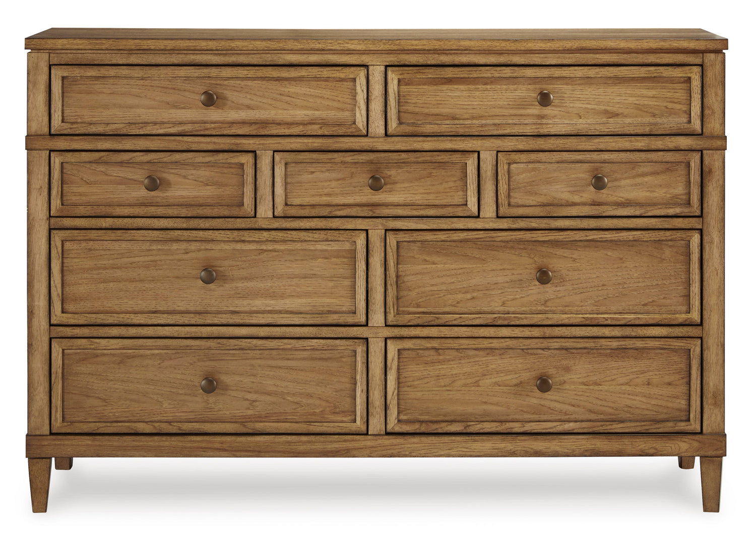 Taking a timeless approach to bedroom beauty, this dresser brings easygoing elegance to the everyday. With its light brown wood tone, it seamlessly slips into your room’s aesthetic. Dark bronze-tone pulls accent the assorted storage drawers, adding to the dresser's fresh approach to transitional stylings.