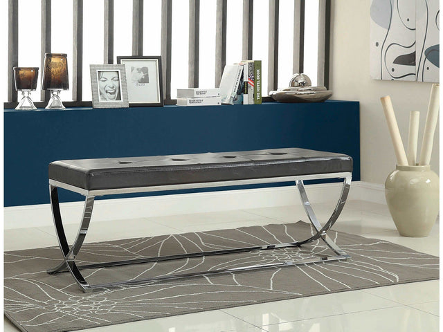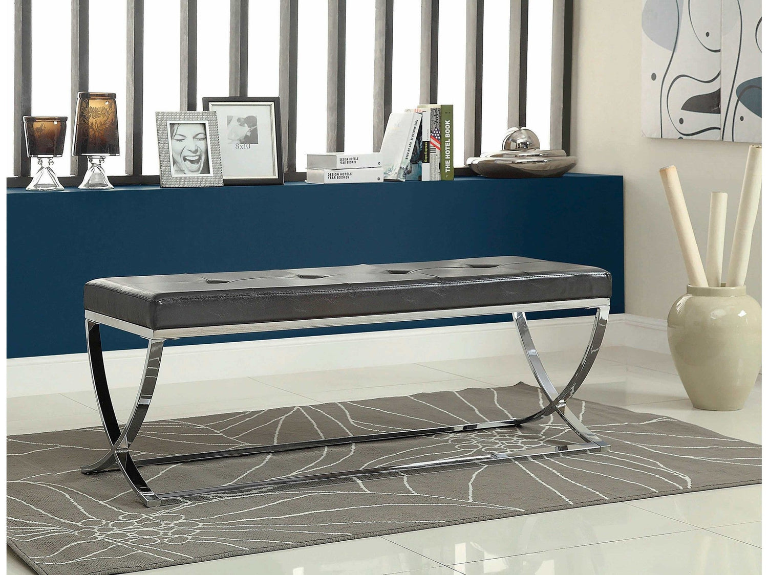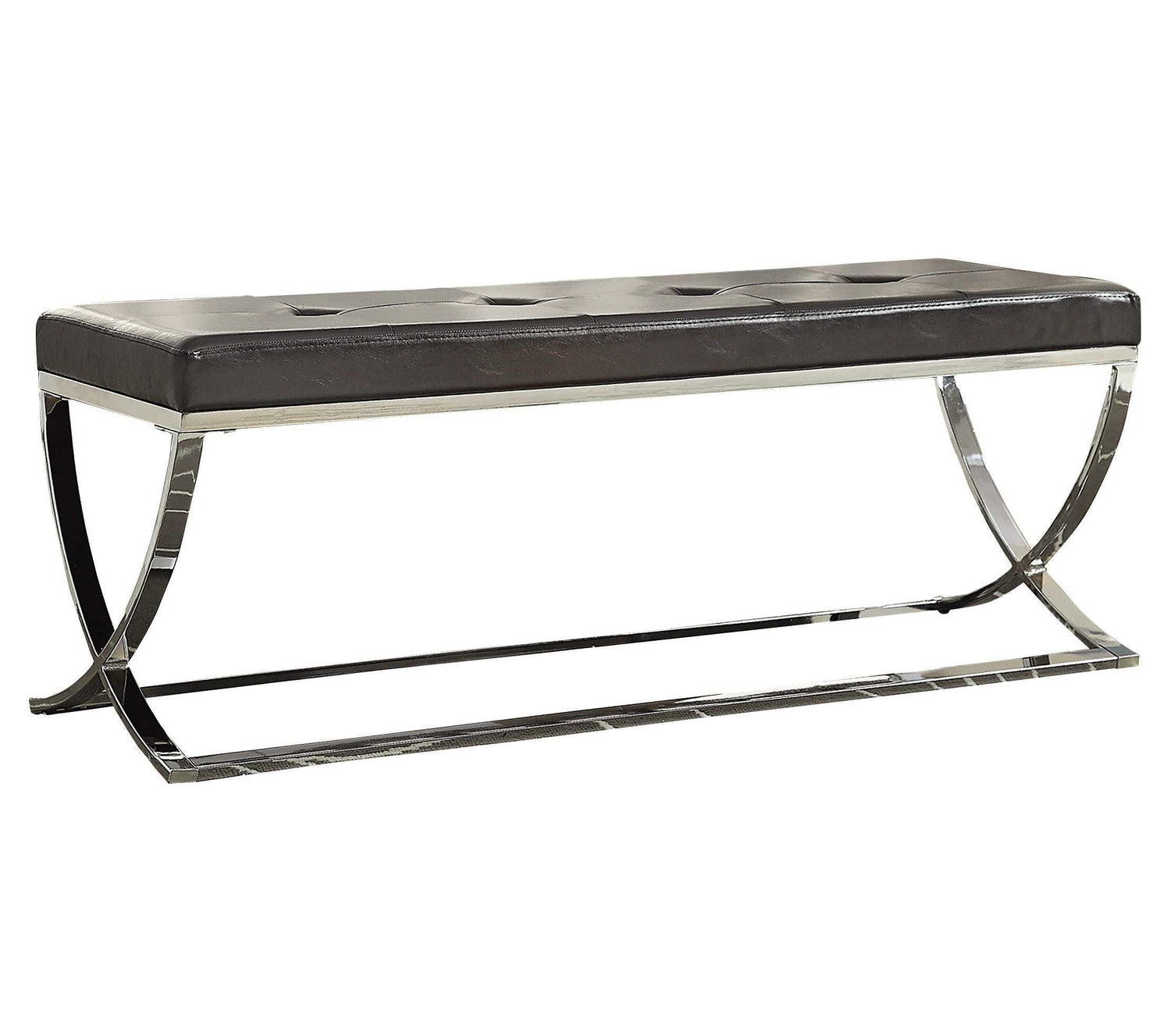 Venture into a new style of contemporary design. With a slender silhouette, this elegant bench offers the benefits of furnishings and the aesthetic of accent décor. An emphasis on minimalist styling belies ornate touches in a profile blending gentle contours on its chrome finish frame with a sleek black leatherette wrapped surface. Just enough padding provides optimal comfort and a tasteful appearance. Decorative tufting rounds out the sophisticated features that shape this bench into a solid choice for upgrading a modern sitting or living room.