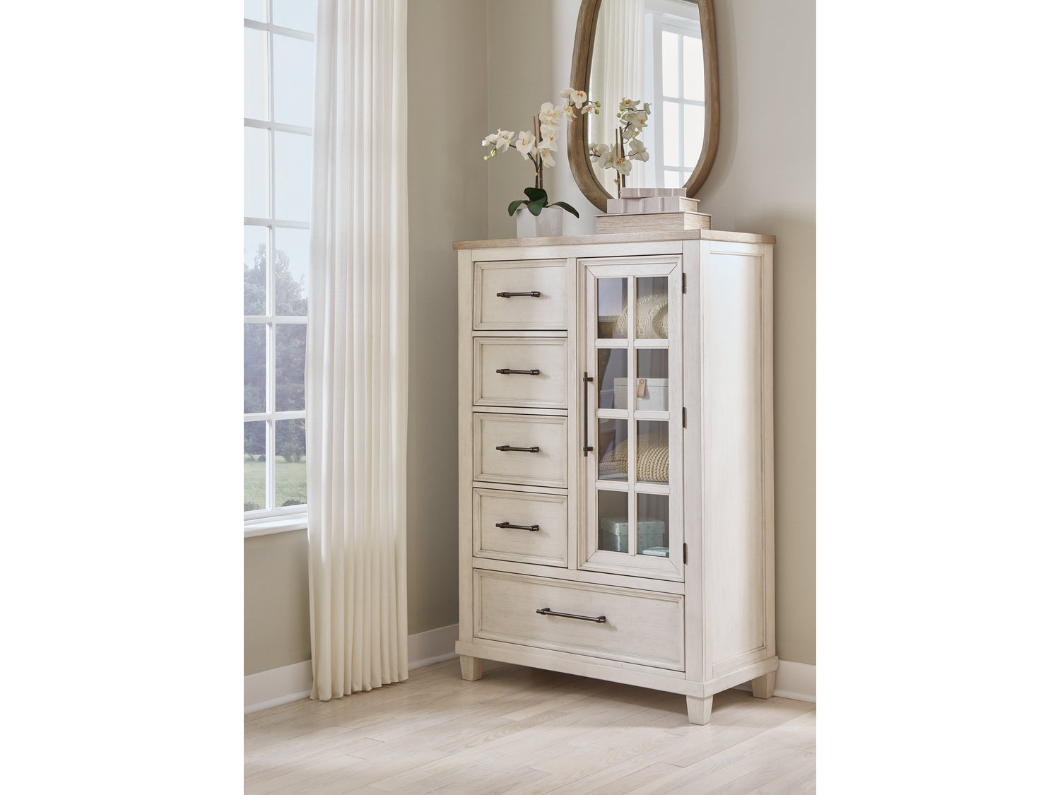 This door chest elevates the art of modern farmhouse design. Its two-tone aesthetic blends antiqued white and light grayish brown for a charming finish. Framed drawer fronts and a windowpane door lend a country feel. Conveying a feeling of relaxed comfort, the chest is sure to carry you away to a dreamy time and place.