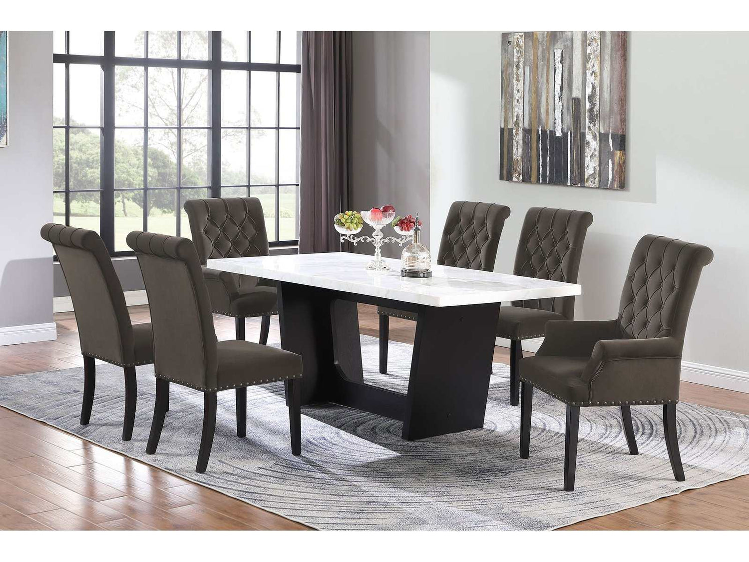 Bring together family and friends at this modern rustic style dining table set. The table features a rectangular, thick, white marble top that is spacious enough for six people. Sleek open and airy trestle base with a center punch out, rustic espresso striking color combination lends a dramatic touch and grounds the room elegantly. The set of chairs with a rolled backrest with button-tufted details lends a traditional aesthetic to a space. Also, bringing to your home the classic elements is a padded seat with individual nailhead trim that offers a charming detail.