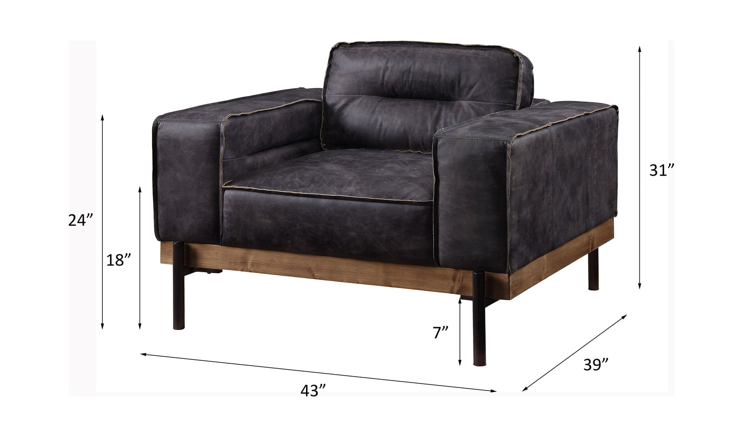 Part of the handsome Silchester Collection, this modern industrial chair will look great in any contemporary space. Contrast stitching makes the antique ebony top-grain leather upholstery pop, and highlights the warm color of the wooden trim base. Metal spindle legs visually lighten the substantial proportions of this sofa set. Enjoy wide track arms and comfortable feather and foam seat construction, and relax in style.