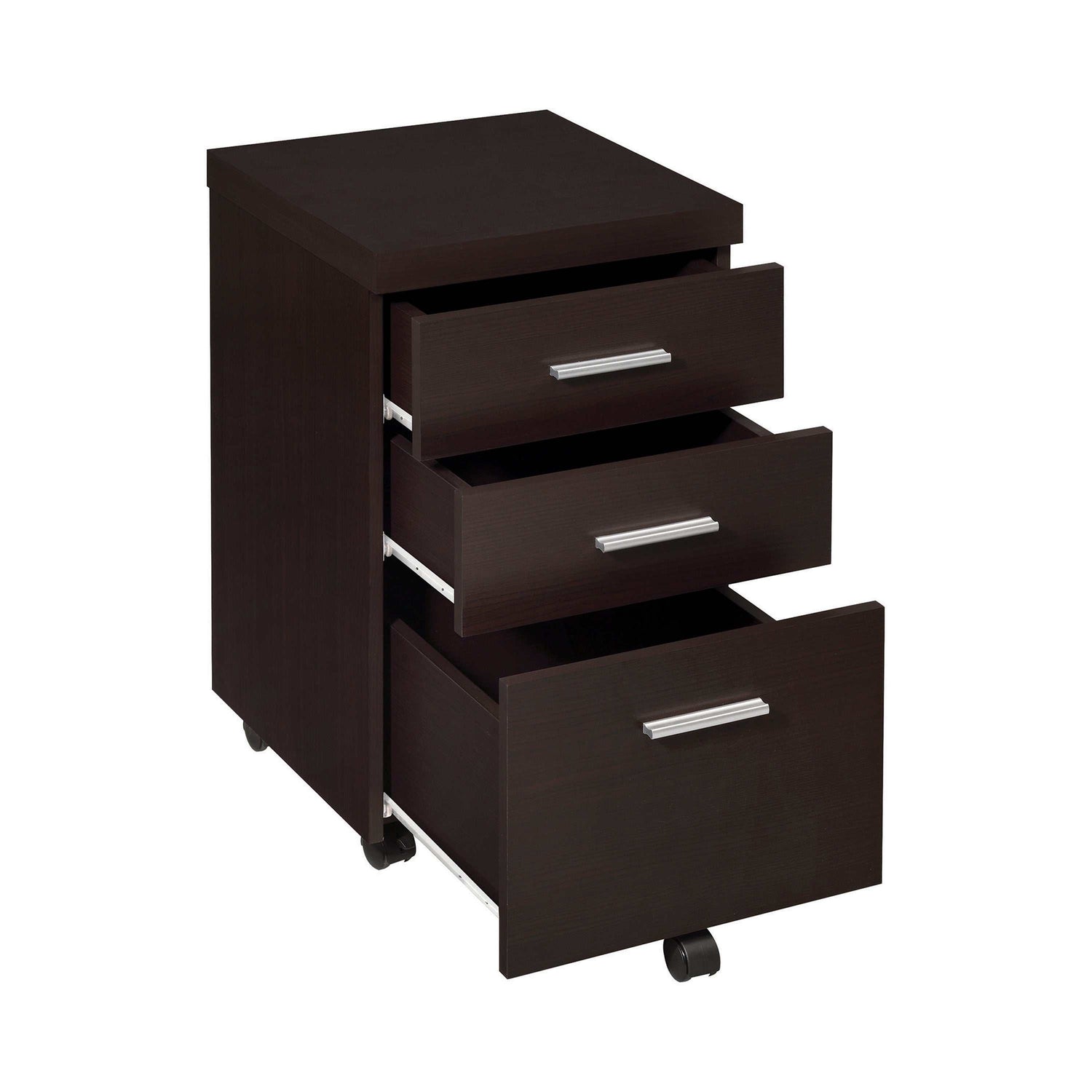 Add no-nonsense glamour and functionality to a den, office, or even a bedroom. With casters built in, this file cabinet can be easily transported from room to room. Its cappuccino finish blends elegantly with silver handles, adding attractive appeal. Crafted from top quality materials, this cabinet is as sturdy as it is stylish. It combines perfectly with a desk to create a convenient workstation.