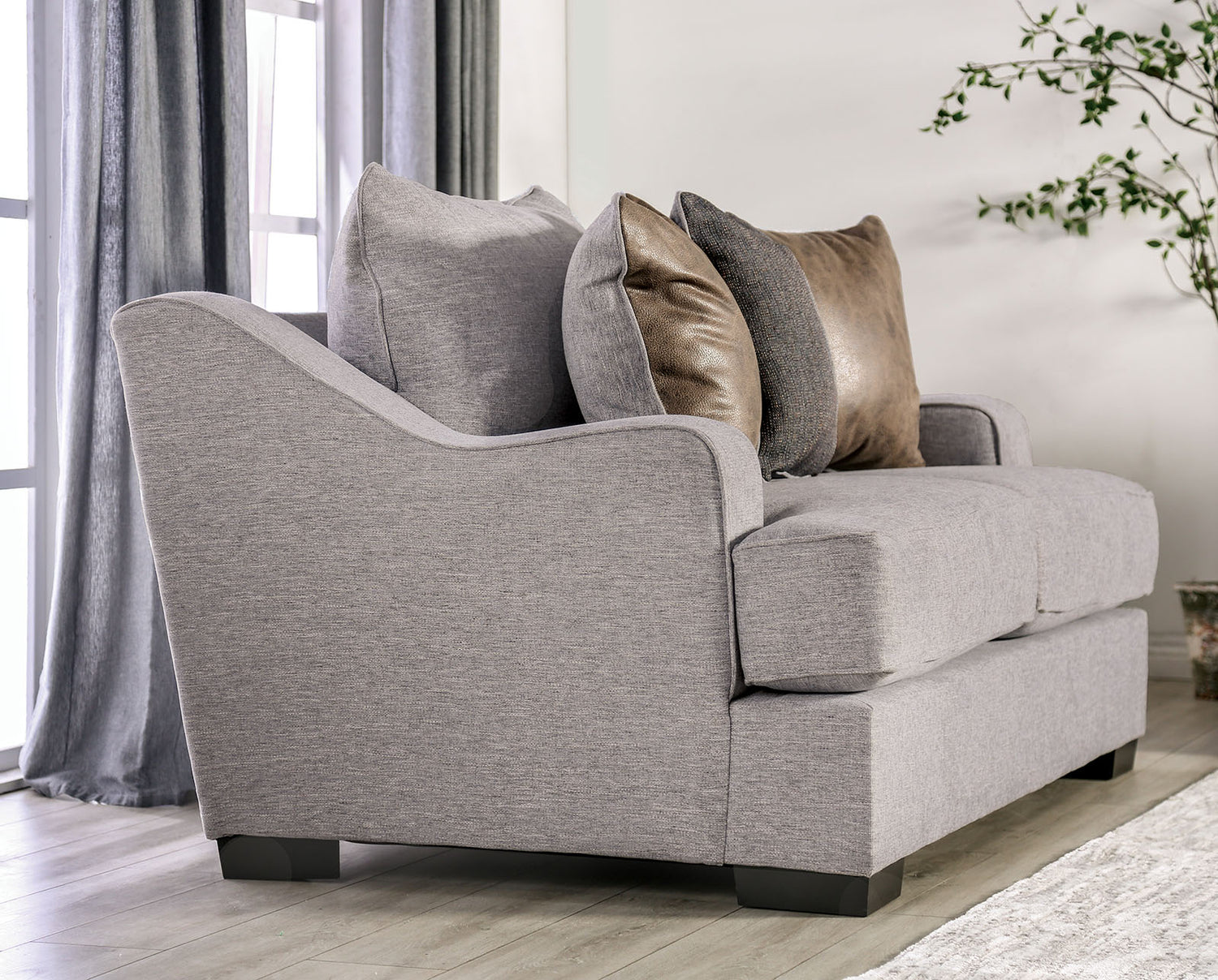 Give your guests a warm welcome with this deluxe living room ensemble. Soft fabric in a neutral tone wraps every inch of this piece, from the solid wood frame to the loose back pillows. Bold, curvaceous arms come enhanced with welt trim, so are the seat cushions filled with foam and resting on a sturdy spring base. The throw pillows come in muted dark tones to beautifully complement the lighter shade of the comfy, oversized seats.