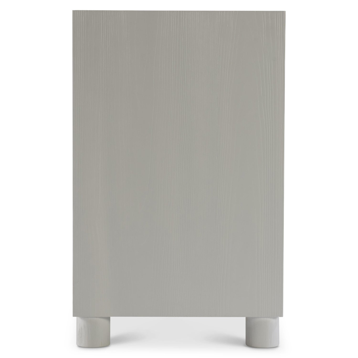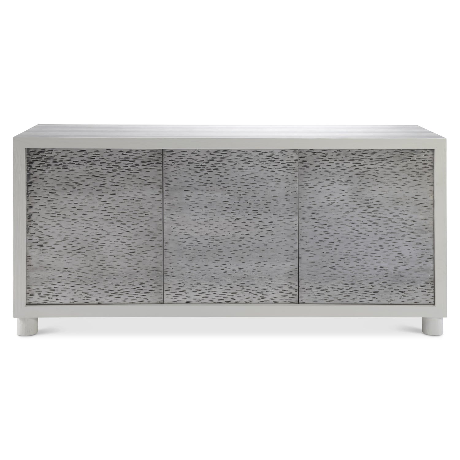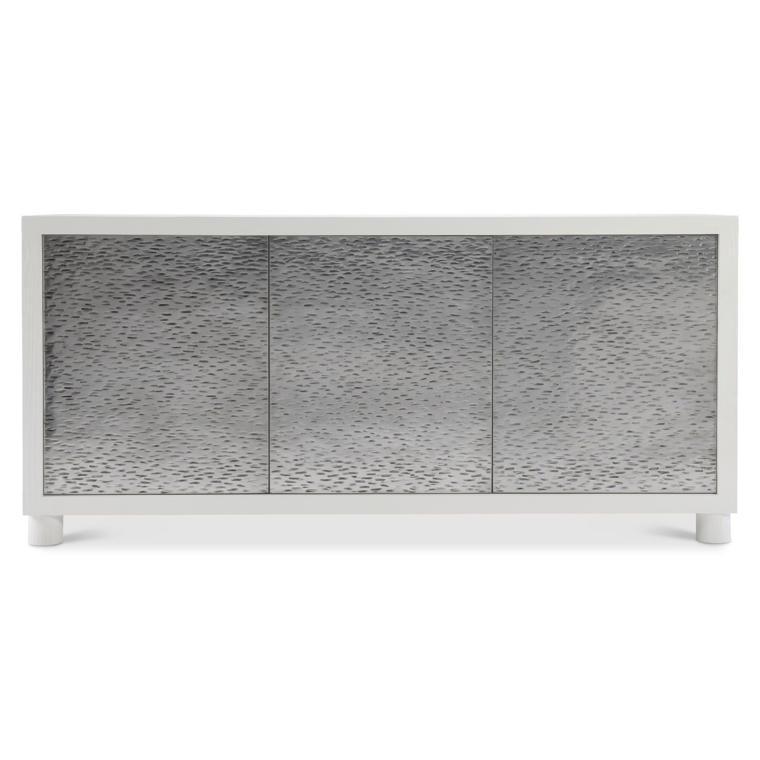 - Pine case in Azucar finish with polished, pitted aluminum overlays on doors in Silver Cloud finish