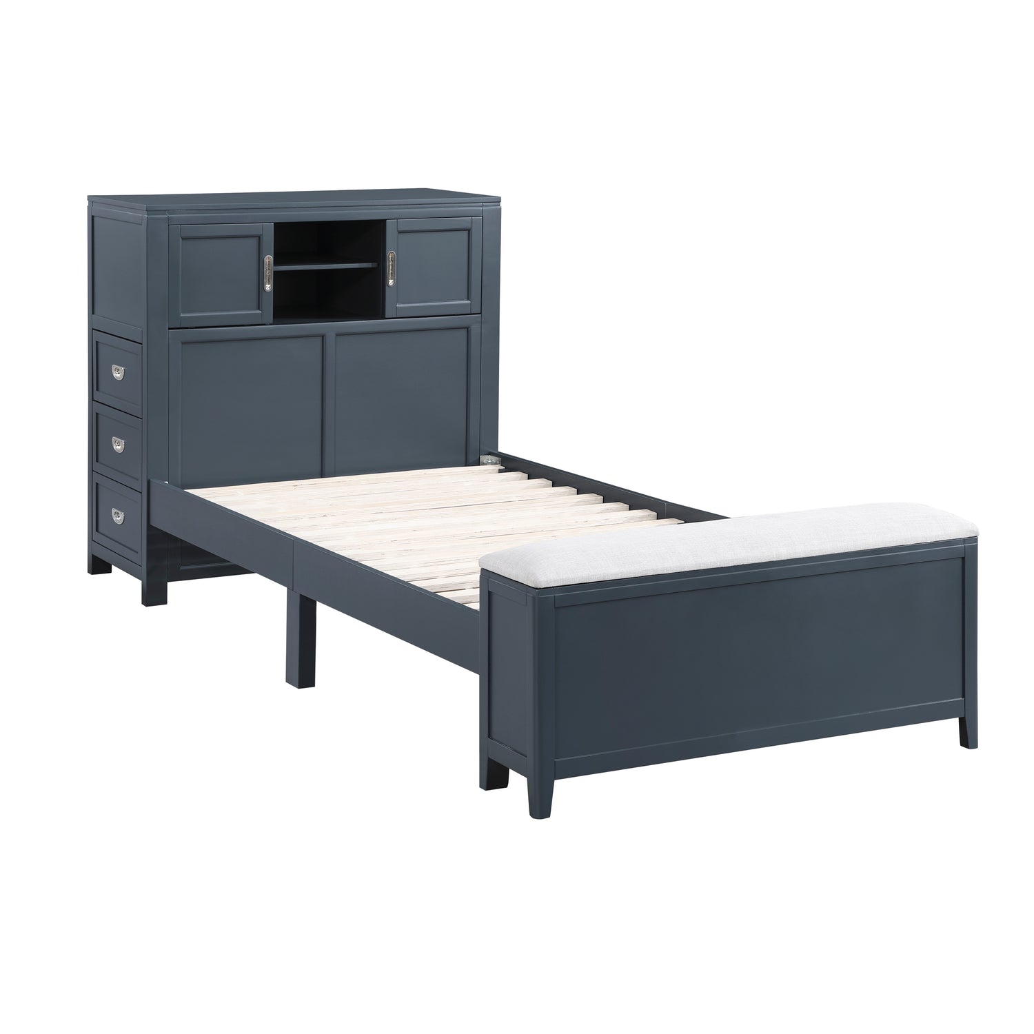 Sloane Navy Blue Twin Bookcase Platform Bed with Hidden Desk, Stool and Storage Bench
