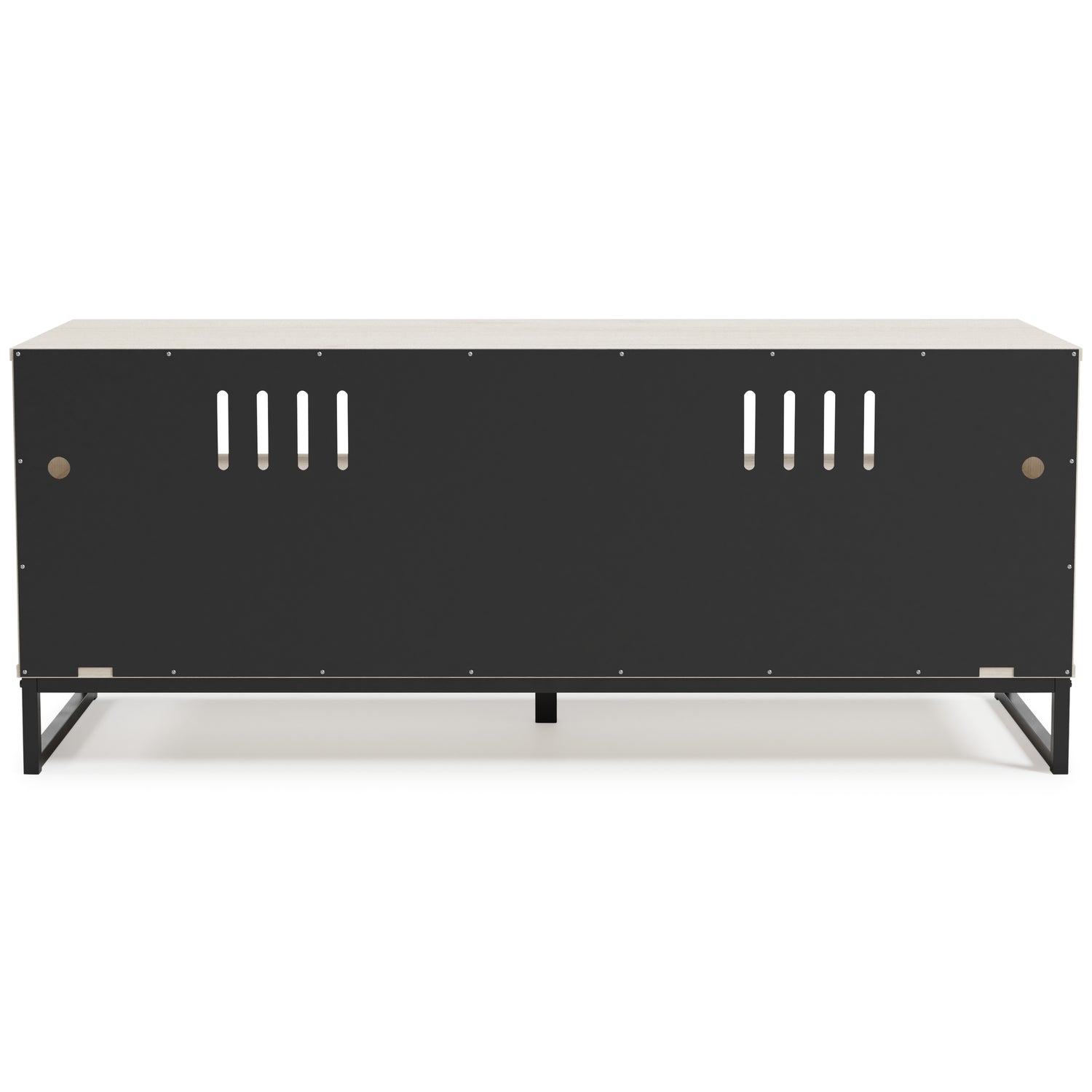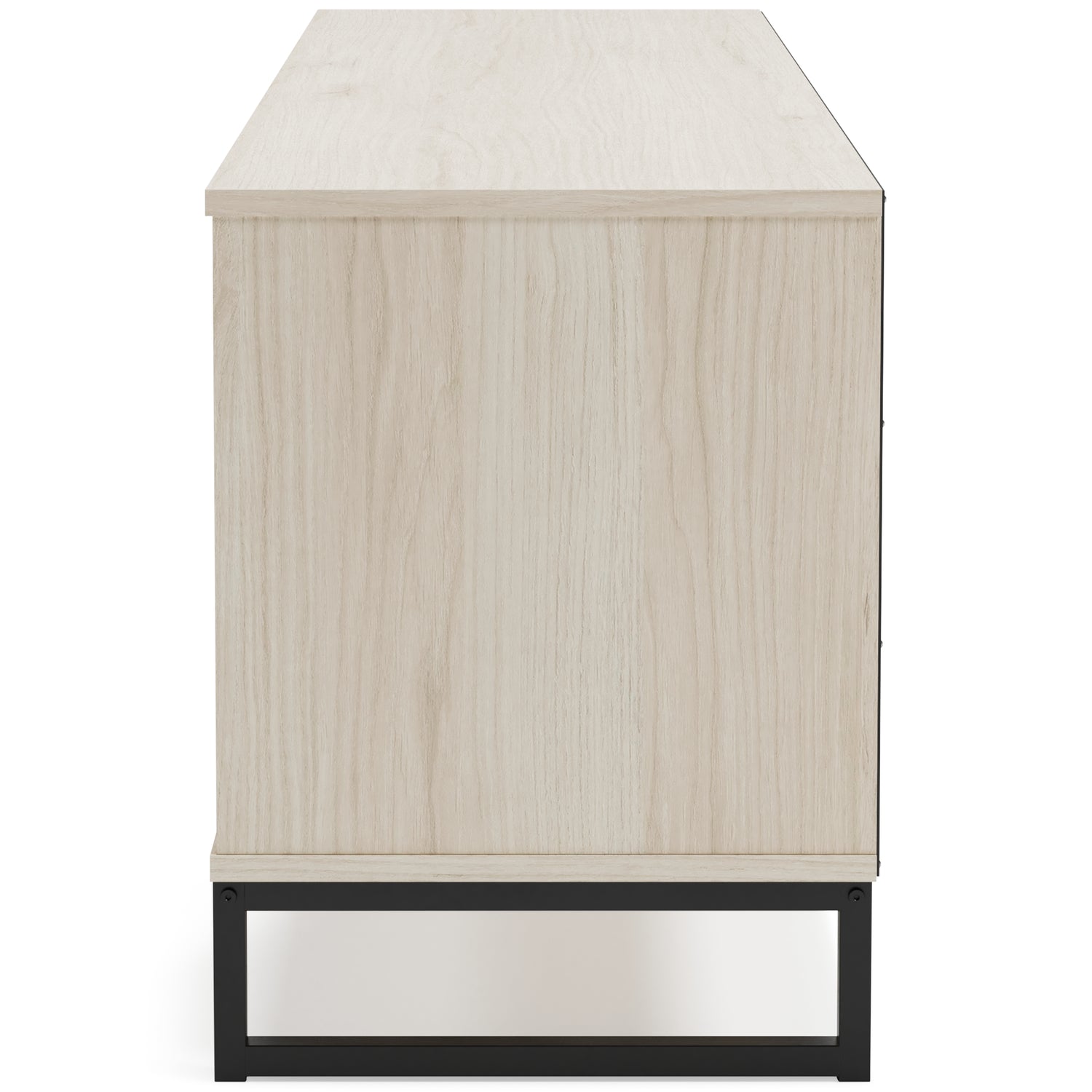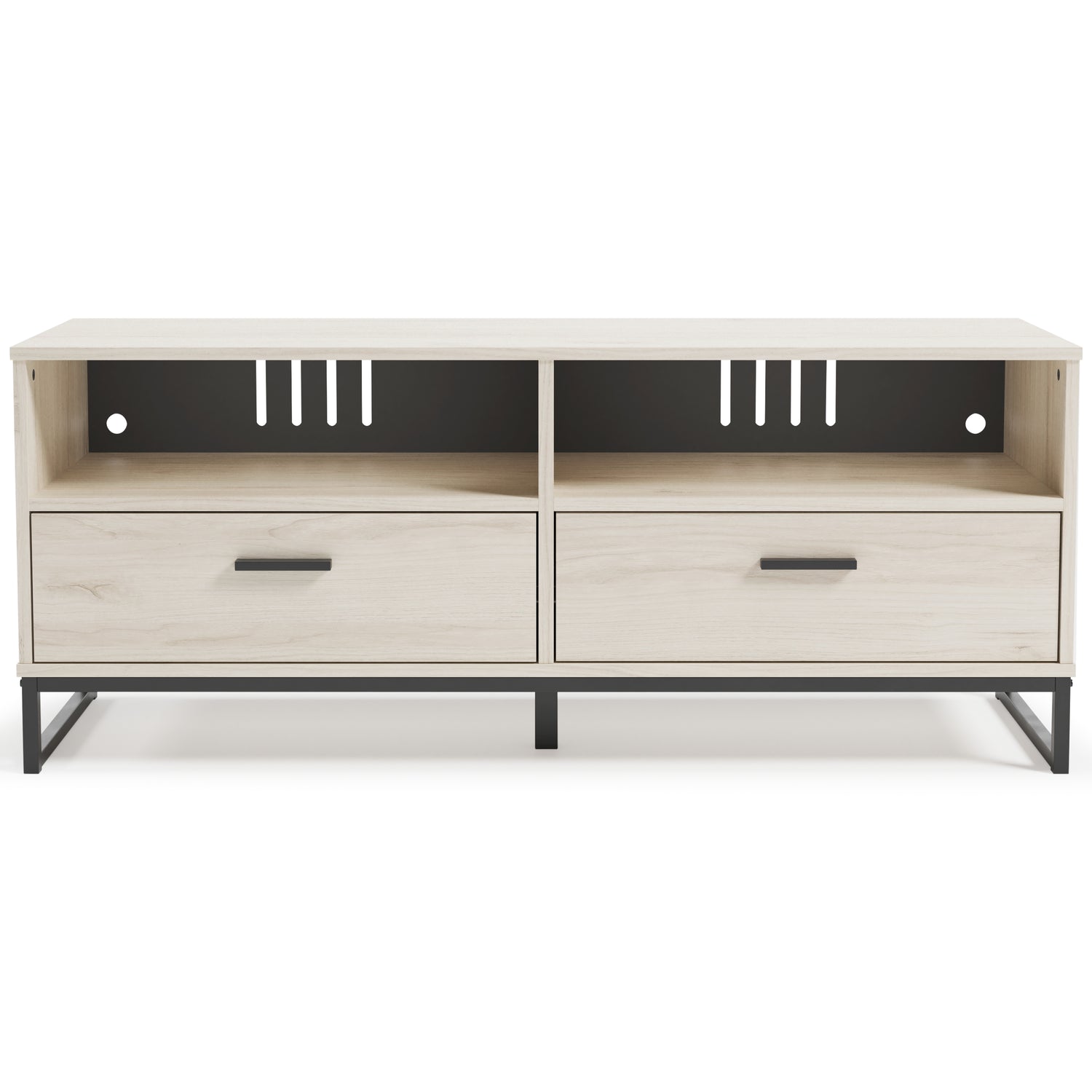 Light and bright, this TV stand is inspired by chic design. A light natural finish over replicated oak grain offers an authentic touch. Open shelving and two smooth-gliding drawers provide handy storage, while metal legs and pewter-tone handles bring an edgy flair.