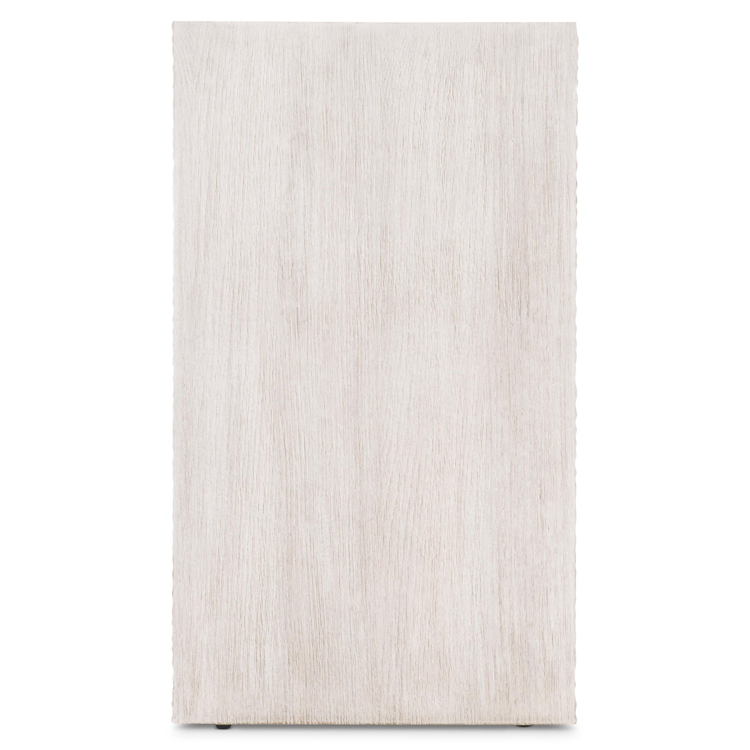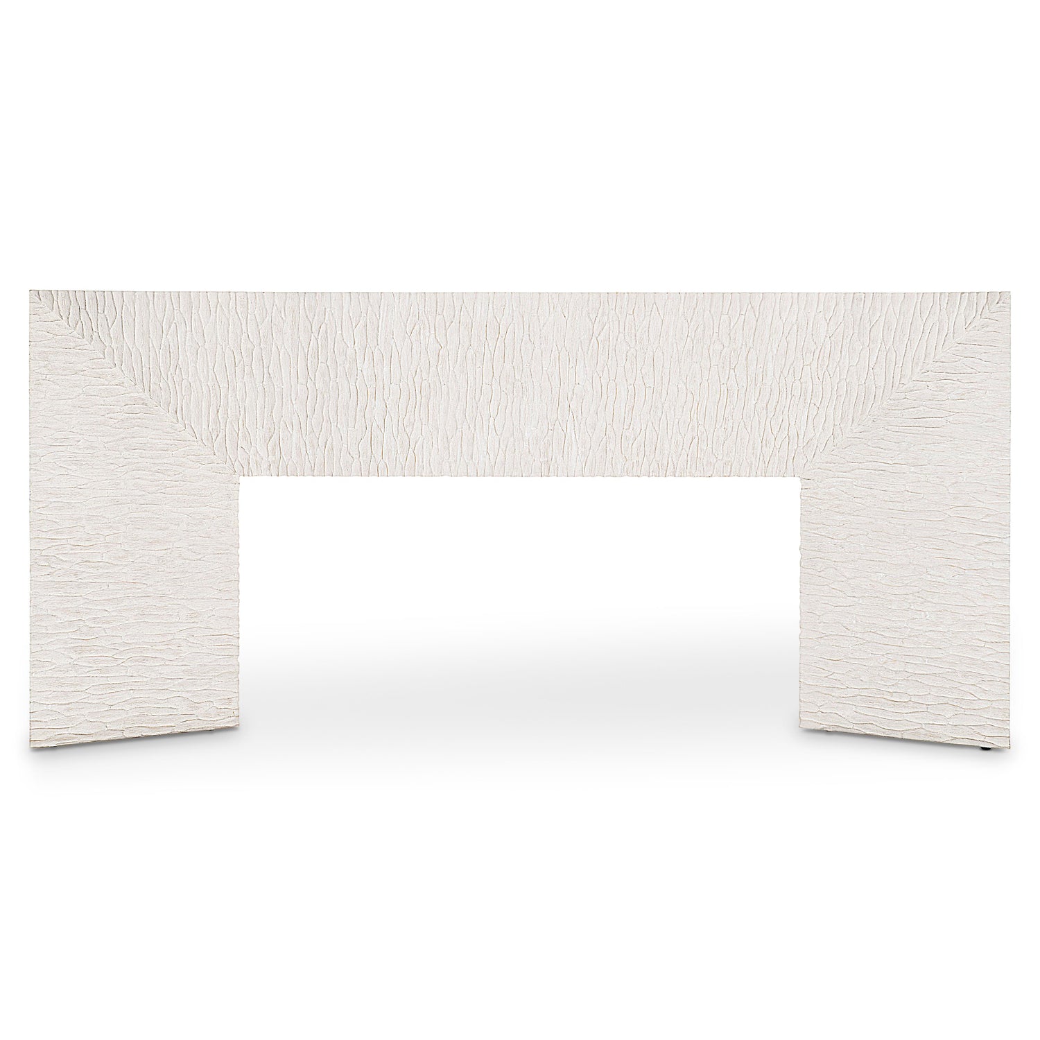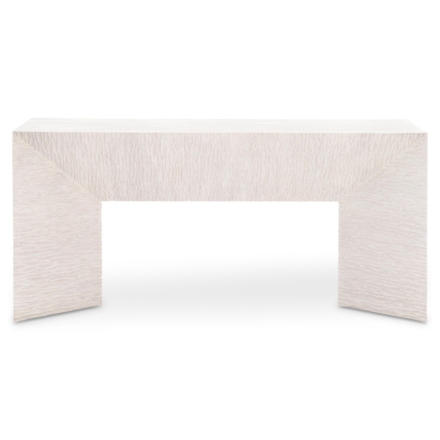 - Weathered Bone finish on wood veneered top and ends and on cast chiseled pattern front and back of console table