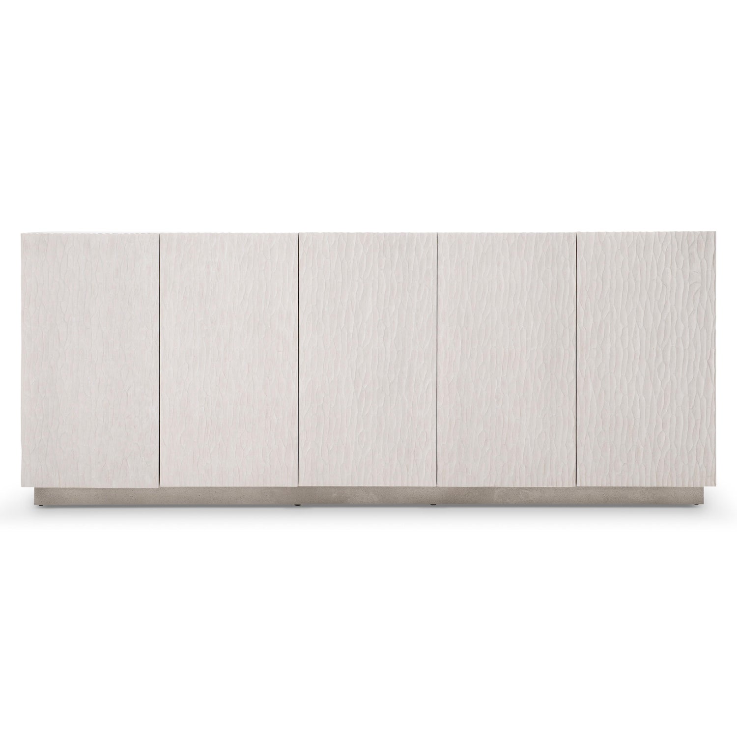 - Five soft-close/self-close concealed hinge doors with cast resin overlay in a chiseled design in Weathered Bone finish