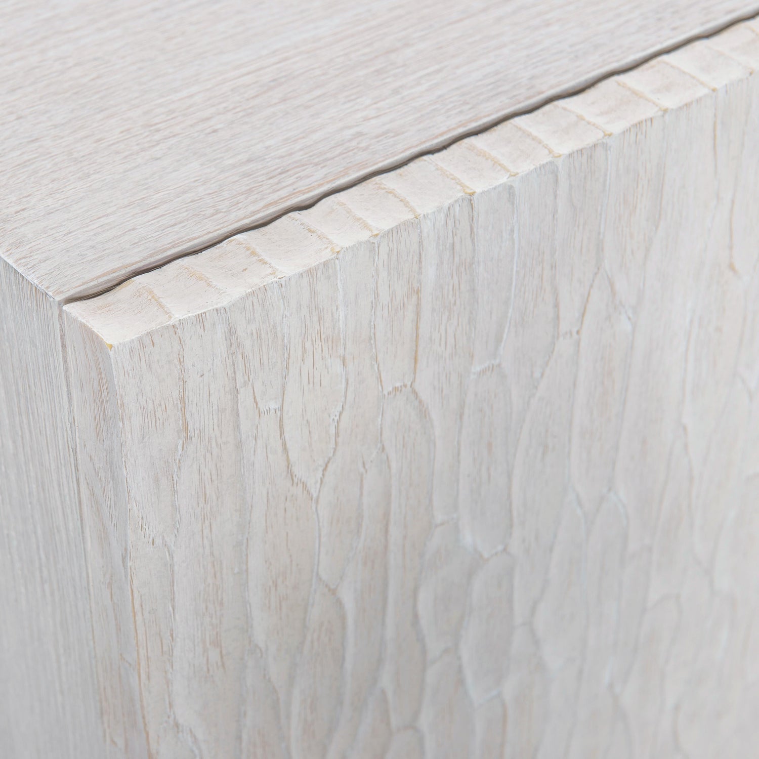 - Three soft-close doors with chiseled cast resin fronts with chiseled metal pulls