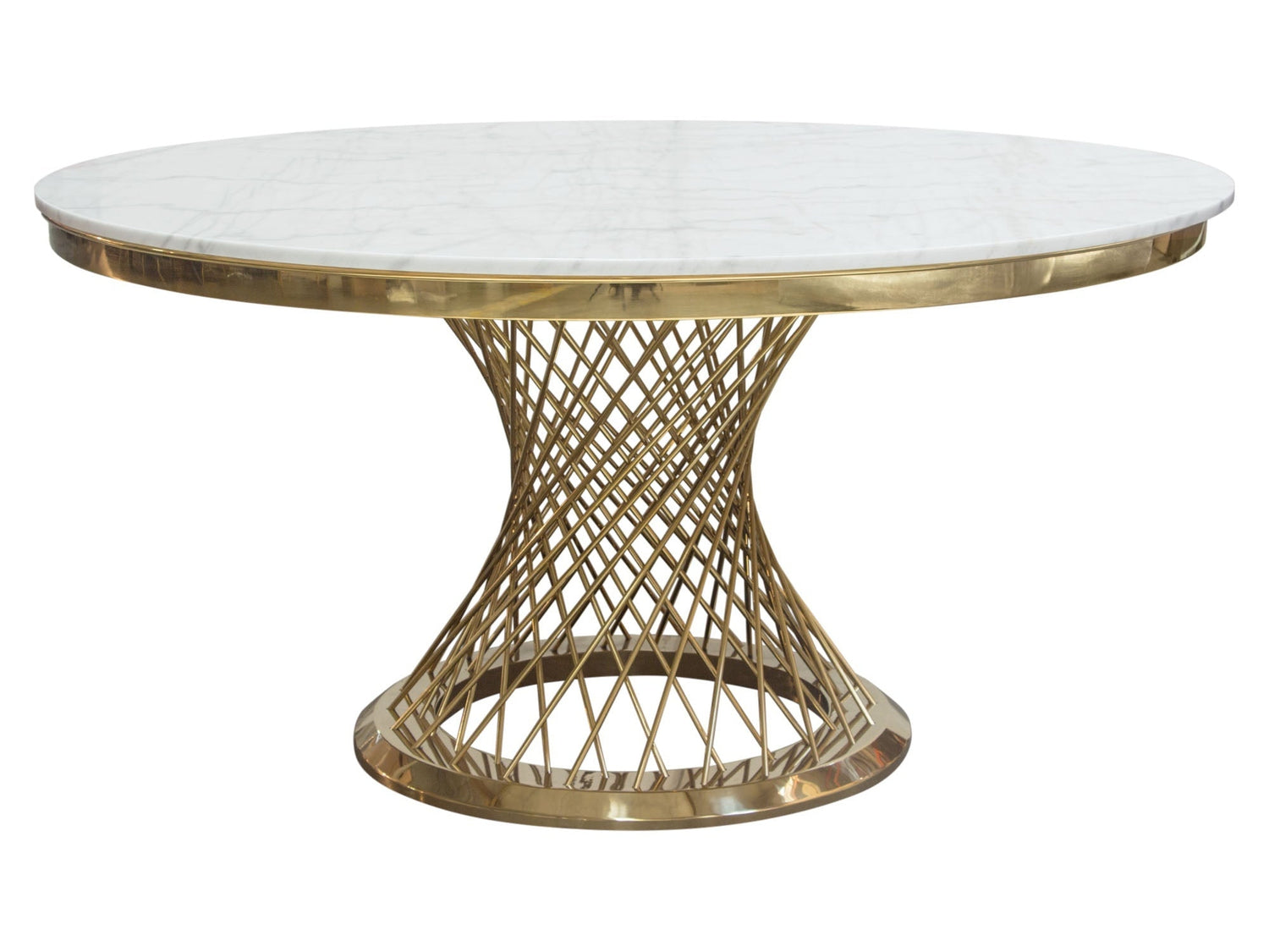 - With its genuine round marble top and Polished Gold Stainless Steel, Spiral Spoked Base, the Solstice Collection delivers a one of a kind addition to any room's decor.
