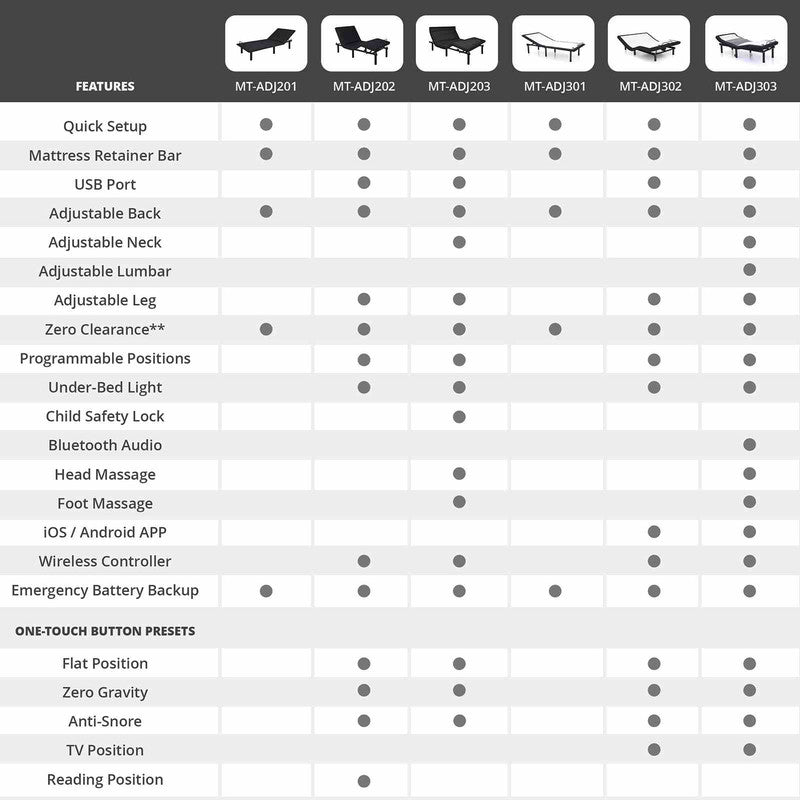 - One-Touch Presets: Flat, Zero Gravity, Alleviate Snoring, TV