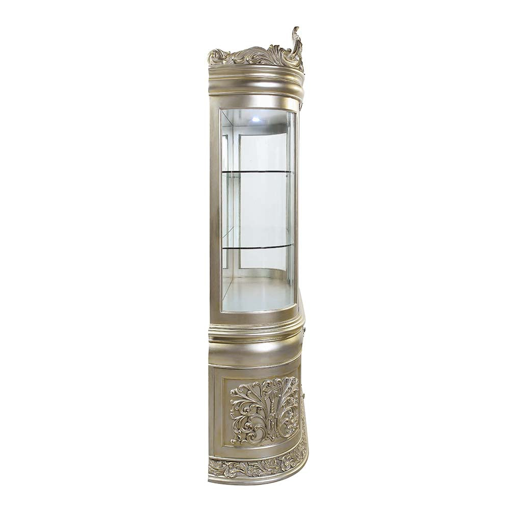 Create an eye-catching functional focal point of opulence with the Sorina curio cabinet that is grand, yet charming and approachable. Finished in gold and silver, the cabinet glistens with a touch of glam, featuring a mirrored back panel and a top crown. Behind the two wooden-framed glass doors are two glass shelves that offer ample space to display and store all your prized possessions.