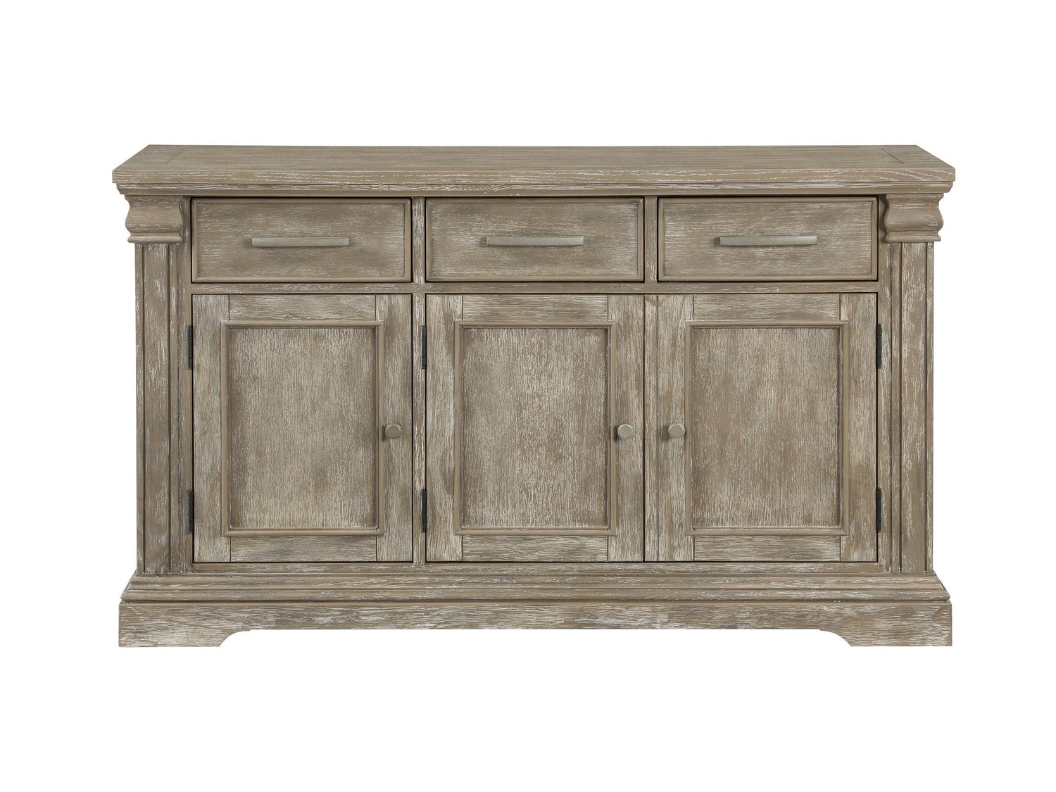 An elegant blend of traditional styling and rustic aesthetic combines to create the look of the Southlake Collection. The wire-brushed brownish-gray finish highlights the oak veneer. The collection features solid wood construction of the server. The server provides ample behind door and drawer storage in which to stow your tabletop accessories. The doors and drawers feature nickel bar and knob hardware.