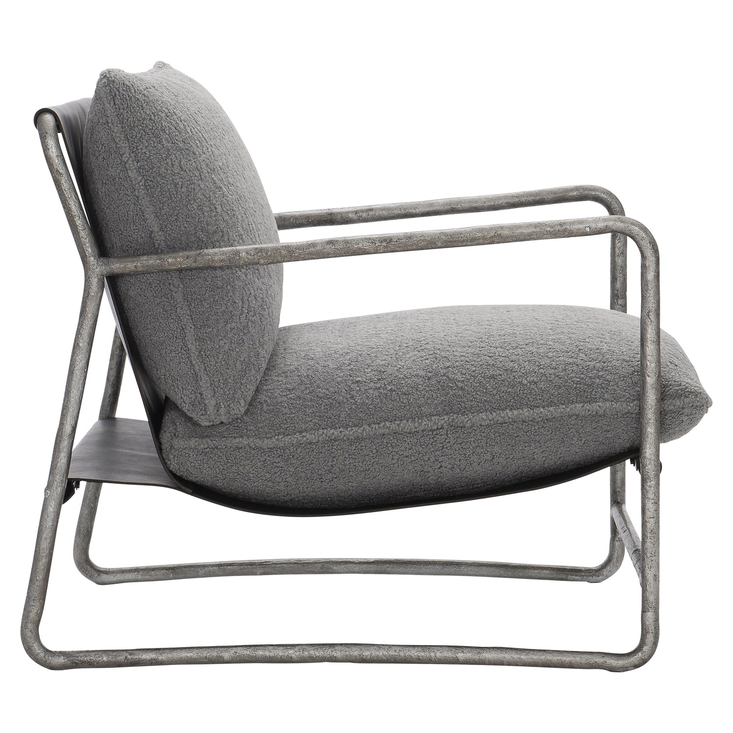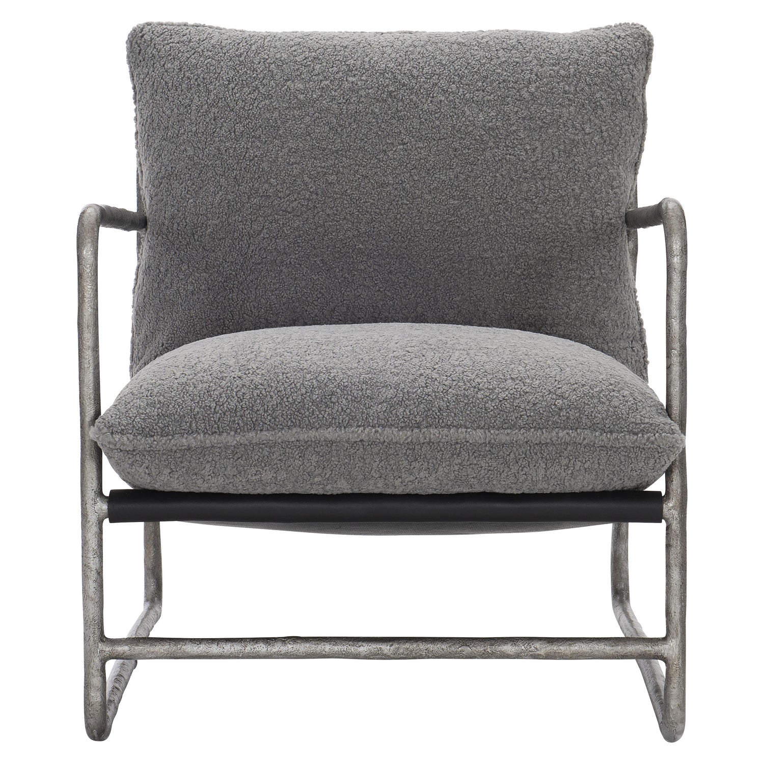 The Spencer Grey Fabric Chair is a living room chair constructed from cast iron and fabric that offers comfortable relaxation. The industrial cast iron frame features distinct knife edge cushions. Its low-slung style gives a relaxed feel for any space.
