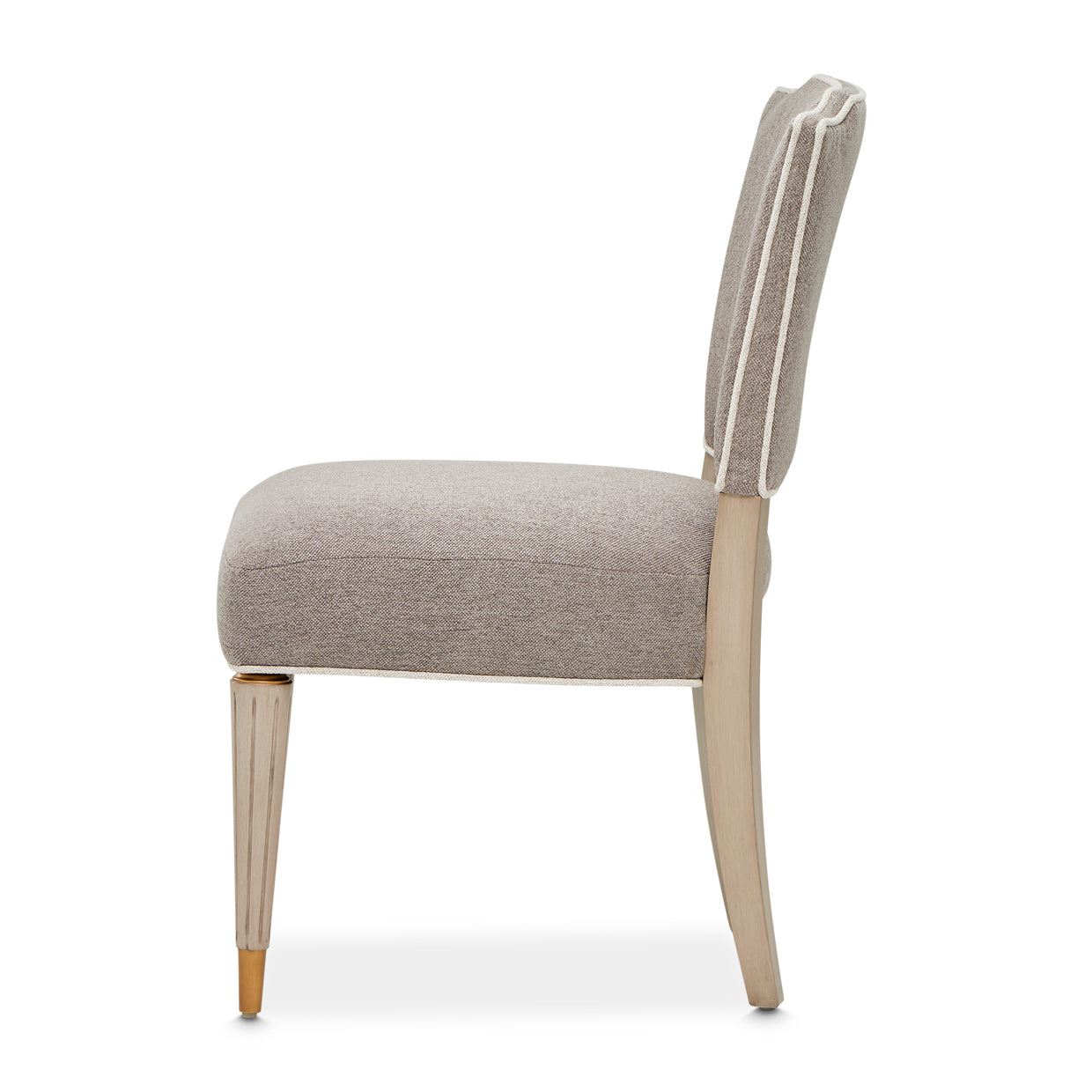 - The chair’s design is anchored by tapered legs with a Dove Gray finish, culminating with bronze-finish tips for a subtle touch of glamour.