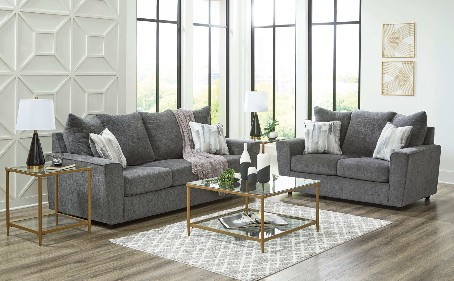 What’s new in neutrals? Shades of gray, of course. Embrace the sophisticated design trend with this gorgeous living room set that offers a clean-lined, contemporary style at a comfortably cool price. Sure to lift your spirits, the plush chenille fabric is fabulously neutral. Contemporary flared arms give it a distinctive flair. This set also arrives with two cool brushstroke accent pillows on each piece to elevate the taste and comfort level.