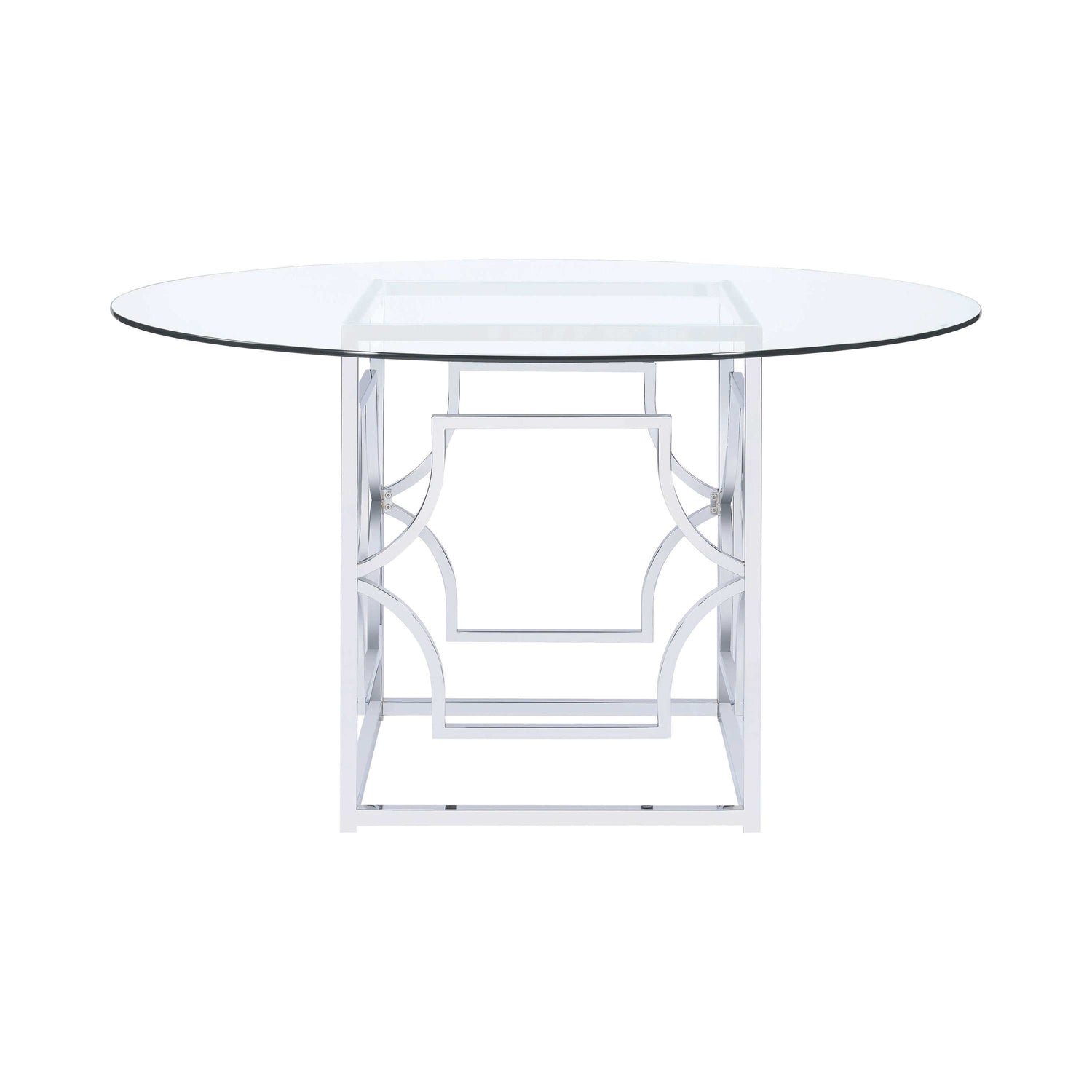 Add a beautiful visual to a dining room with this stunning dining table base. Traditional in style, the metal frame features an openwork pattern. Sharp curves connect to create an airy feel, upgraded by a modern chrome finish. Radiant and metallic, the base enlivens any space with its reflective aura. Top with a round or square glass table top for a show stopping look.