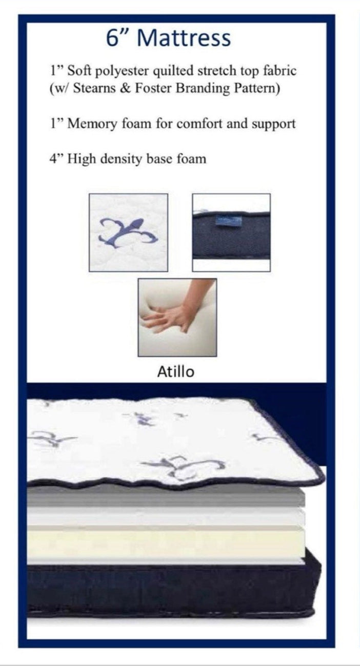 - Features a Stearns & Foster 6” Memory Foam Mattress in queen-size