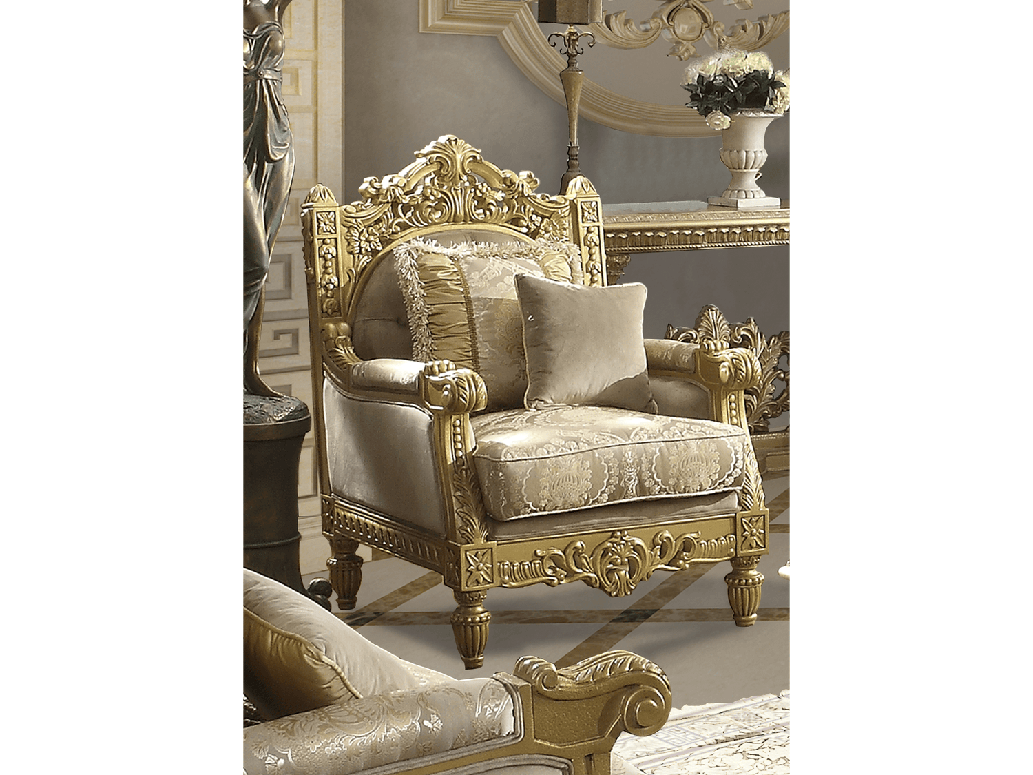 The Stellar Metallic Gold Chair / HD-2659 is a Traditional Chair constructed from Solid Wood/Fabric that provides opulent seating with Classic European style. It features Rich European Luxury Fabric upholstery and wood trim adorned in a Metallic Bright Gold finish. With stylish accent pillows, this chair offers lavish comfort through a blend of chenille fabrics and silky textiles.