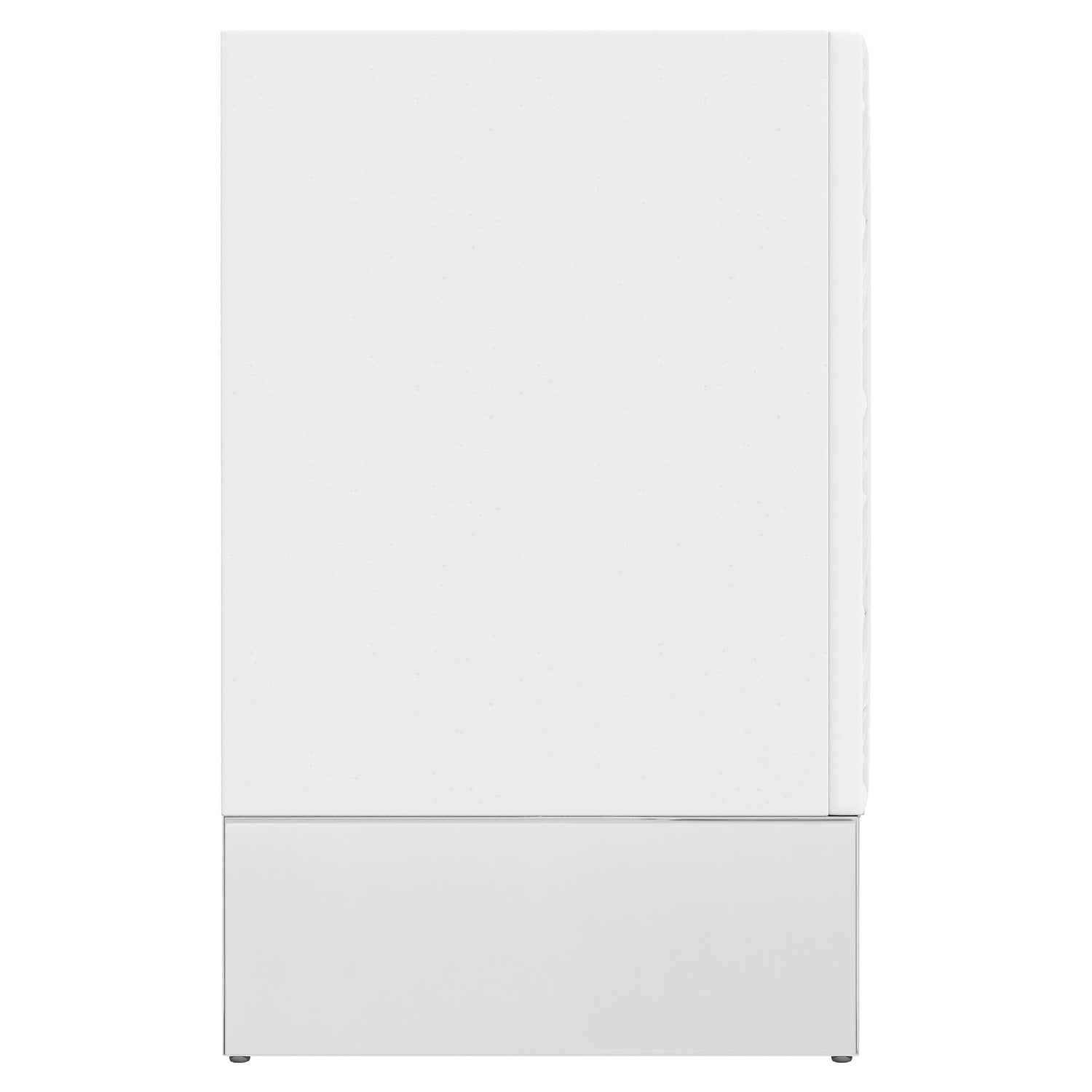- Behind each left and right door is a fixed shelf and a center soft-close drawer with hand-pull cutout, plus an open compartment above and below the drawer