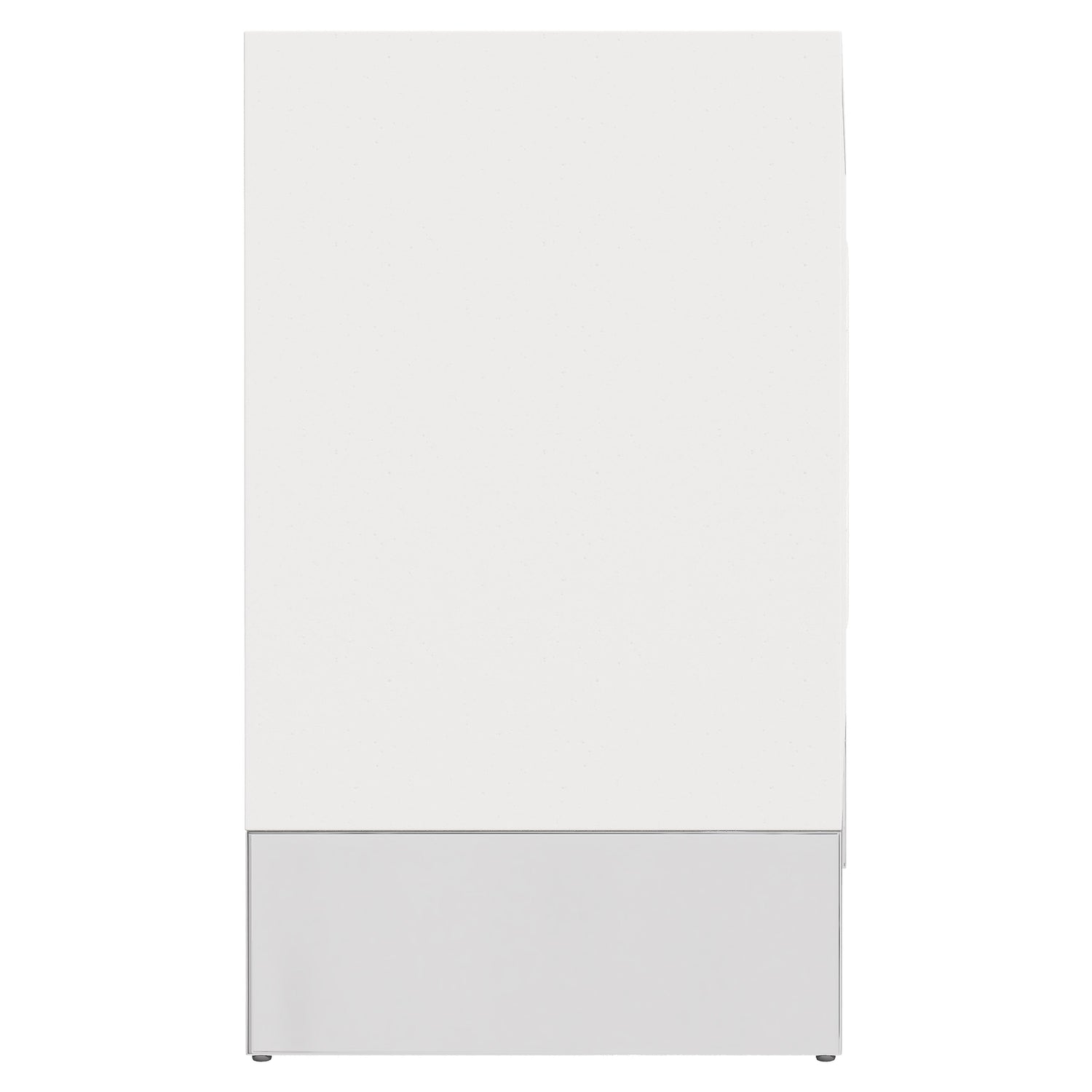 - Below a fixed shelf is one soft-close drawer with hand-pull cutout