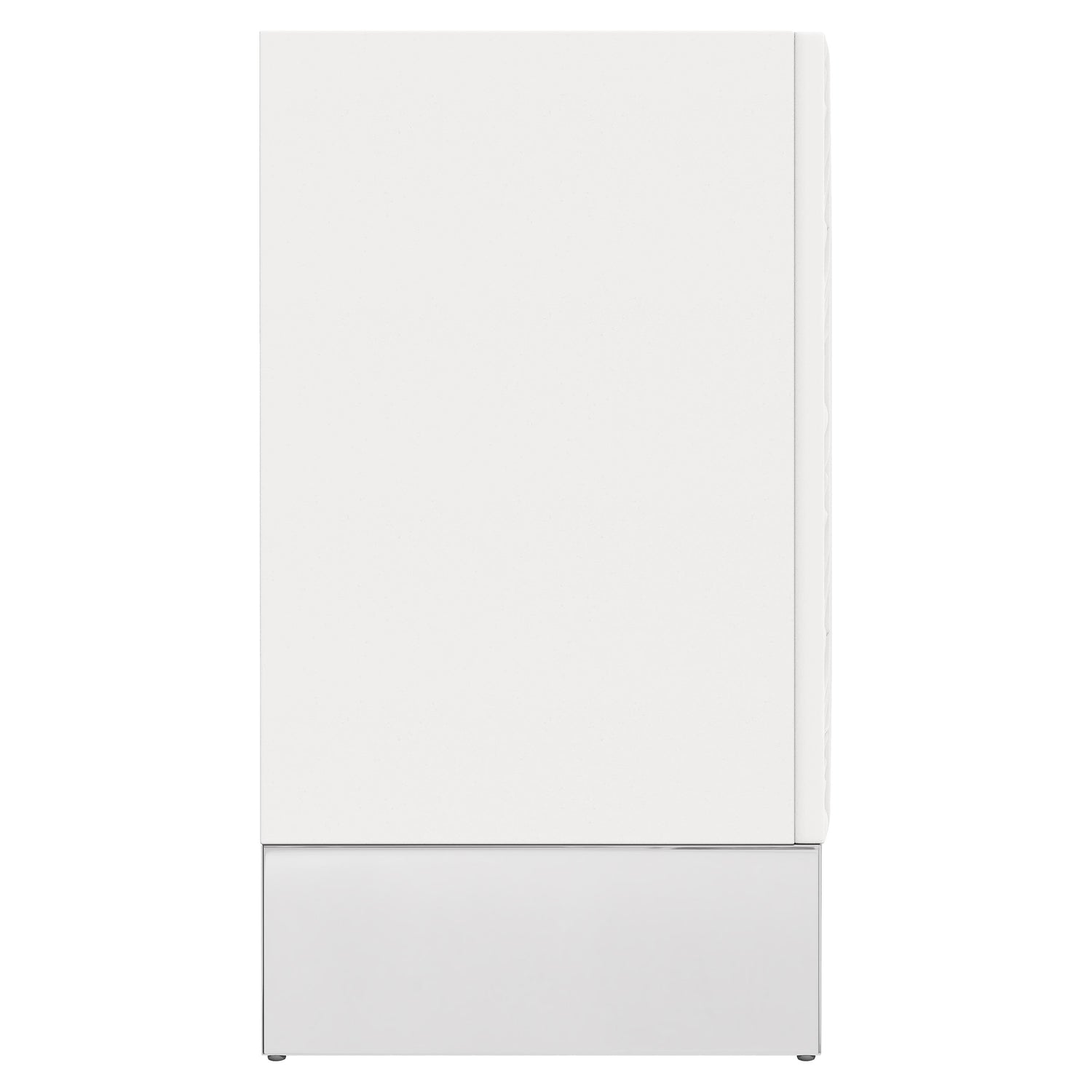- Also behind the center doors below a fixed shelf is one soft-close drawer with hand-pull cutout and two compartments below divided by a center partition