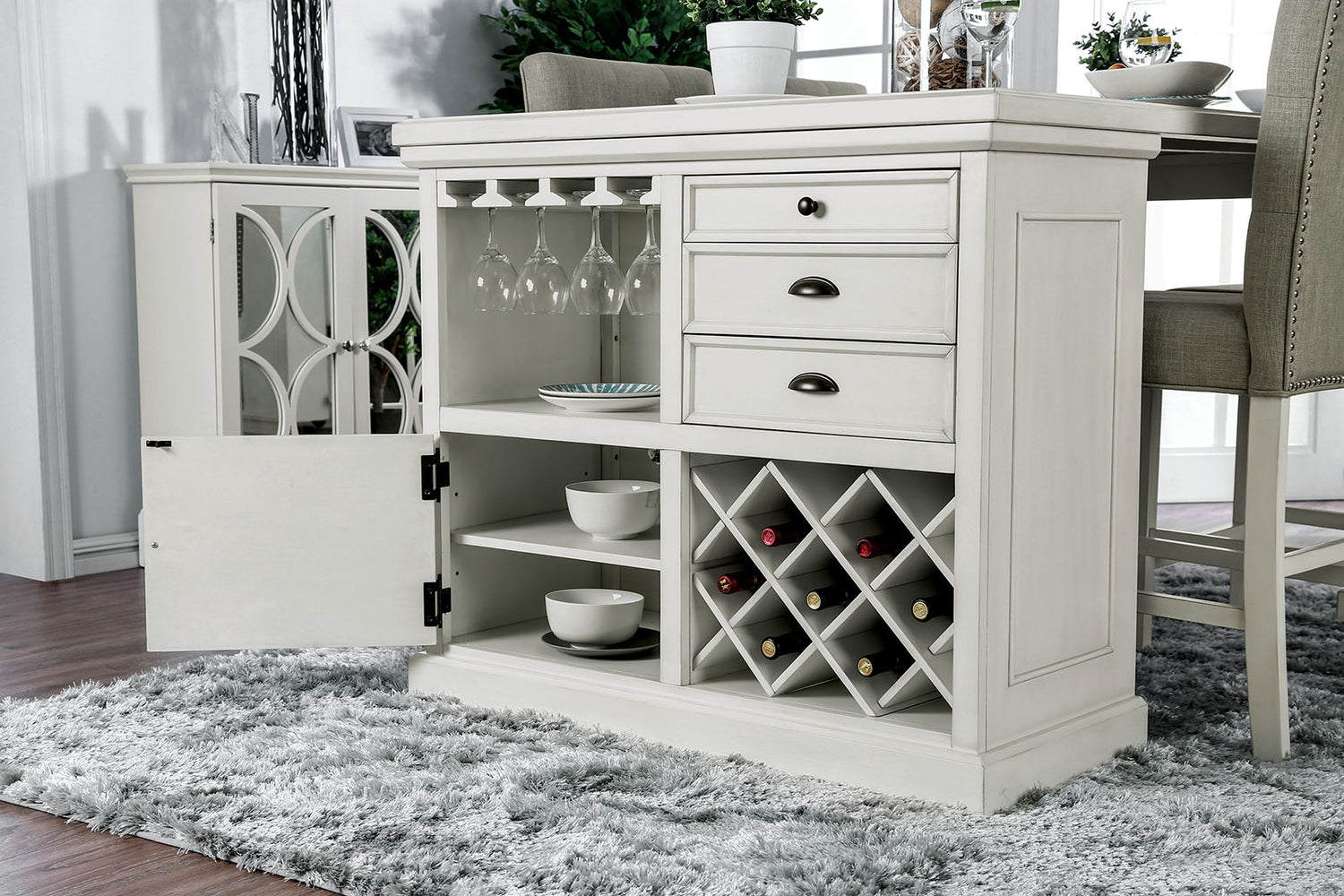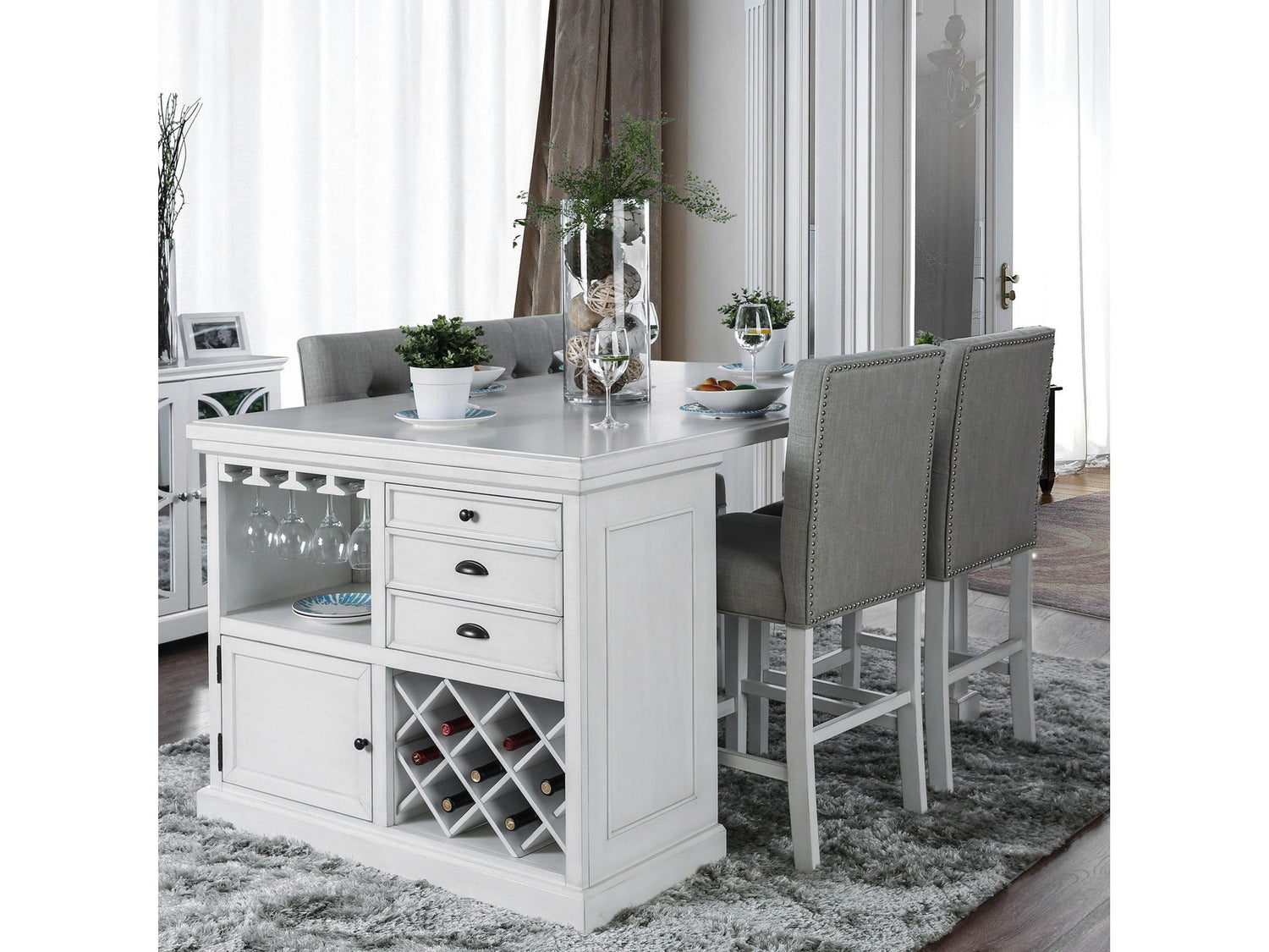 Release your inner utilitarian with this gorgeous natural wood finished counter height table. The table top shows a straight wood grain that compliments the simple lines of the construction. The built in shelving adds the perfect touch of utility or open shelving for decorating. The complimenting wooden chairs feature x-cross backs and rely on its beautiful wood grain as decoration.