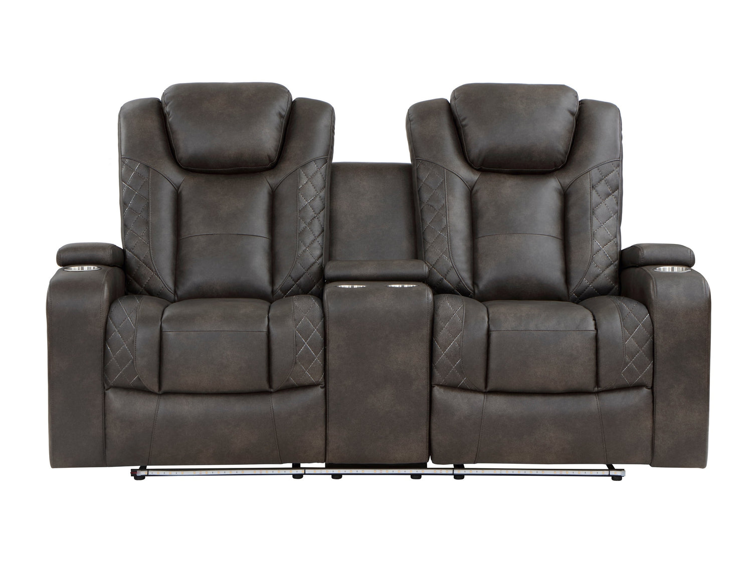 With a combination of stylistic and functional versatility that pairs comfort and modern convenience, the Tabor Collection is outfitted to be a perfect fit in your living room. The love seat features dual reclining ends with power headrests, storage arms, console with cupholders, hidden storage. The love seat is covered in brownish gray premium faux leather upholstery where the hand touches – with faux leather everywhere else - and has diamond pattern accent stitching on the seat that provides subtle decorative touch to the group’s versatile look.
