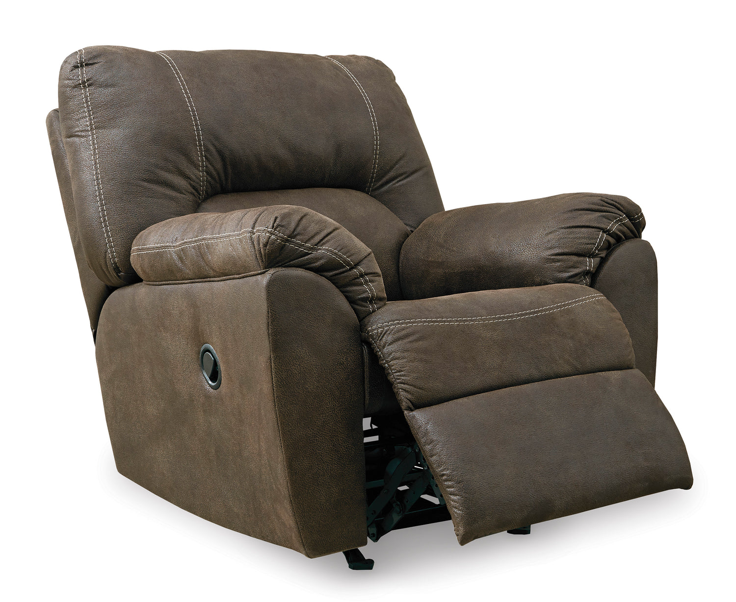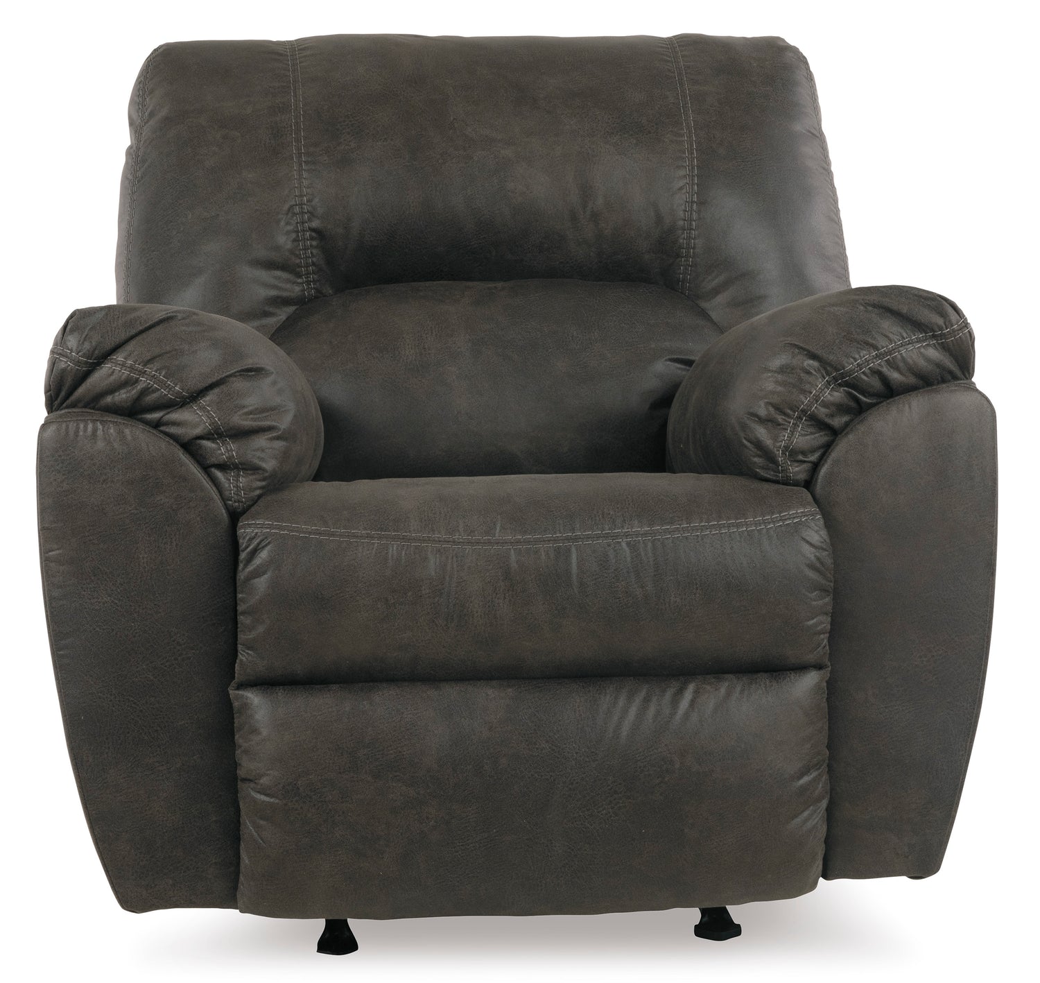 With plush cushions and angled pillow top arms, this rocker recliner takes comfort to a whole new level. Faux vintage leather requires minimal care, making this piece ideal in homes with children and pets. The seat reclines with the pull of a tab, putting total relaxation at your fingertips.
