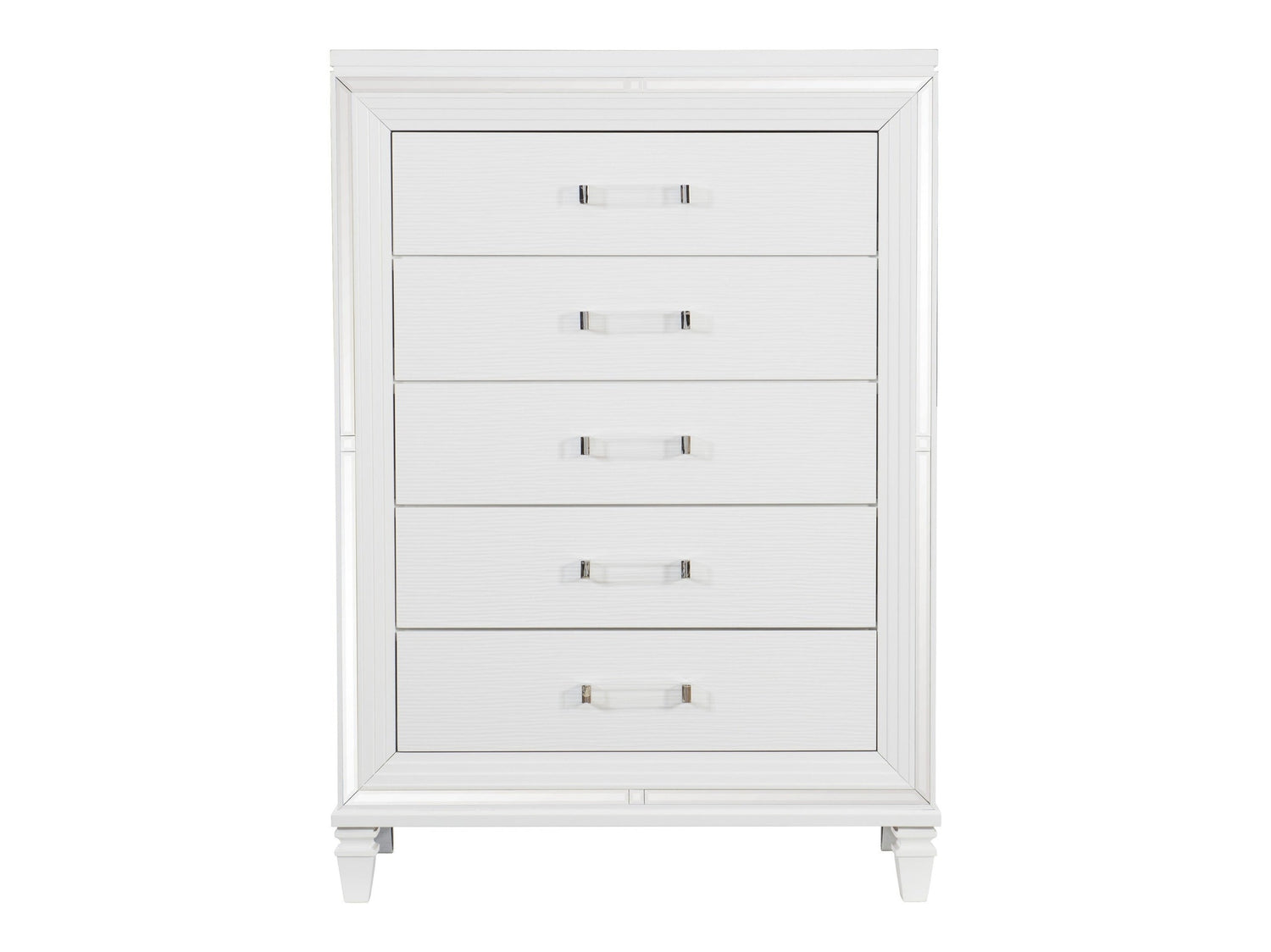 Designed to help your bedroom reach its full glamorous potential, the Tamsin Collection’s unique attributes blend to create a stylish and functional addition to your lifestyle. Mirrored framing provides dramatic enhancement to the chest, illuminating the white finish. Acrylic hardware provides unobtrusive decorative touch to the drawer fronts of the chest.