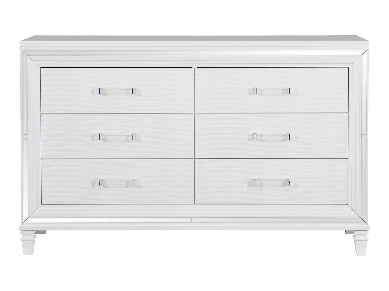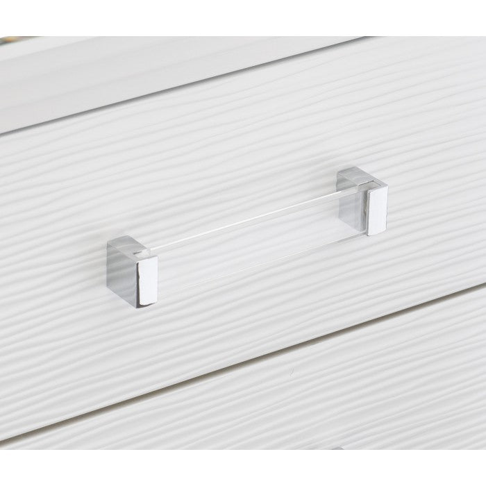 Designed to help your bedroom reach its full glamorous potential, the Tamsin Collection’s unique attributes blend to create a stylish and functional addition to your lifestyle. Mirrored framing provides dramatic enhancement to the dresser, illuminating the white finish. Acrylic hardware provides unobtrusive decorative touch to the drawer fronts of the dresser. Hidden jewelry drawers in the dresser create discrete storage space for your fancy accoutrements.