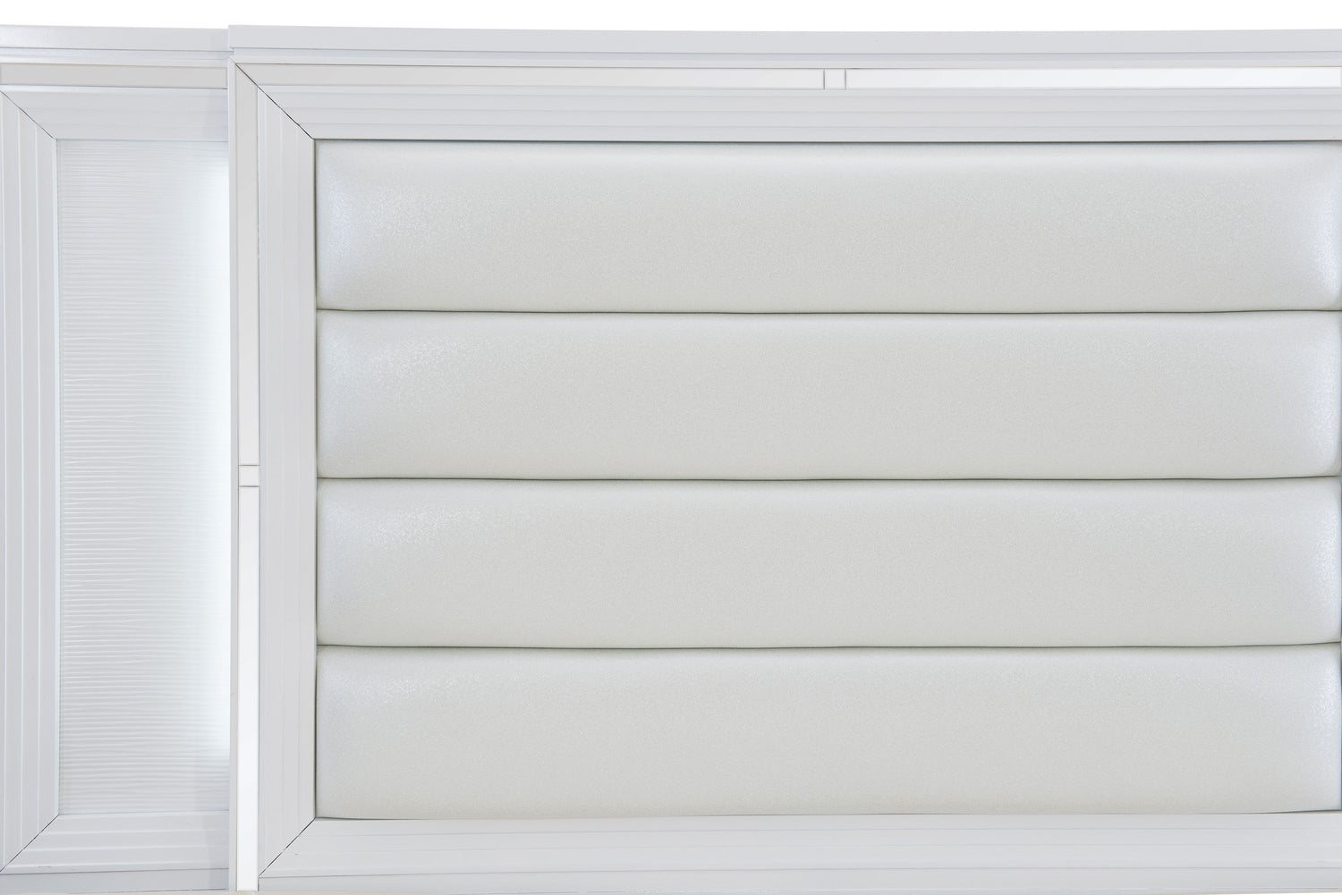 Designed to help your bedroom reach its full glamorous potential, the Tamsin Collection’s unique attributes blend to create a stylish and functional addition to your lifestyle. Mirrored framing provides dramatic enhancement to the Eastern King bed, while LED back-lighting, from the vertical headboard panels, illuminates and highlights the embossed white finish of the collection. Acrylic bar hardware provides unobtrusive decorative touch to the drawer fronts of the storage footboard, with the metallic silver faux leather-covered padded headboard insert lending decorative contrast to the finish of the collection.