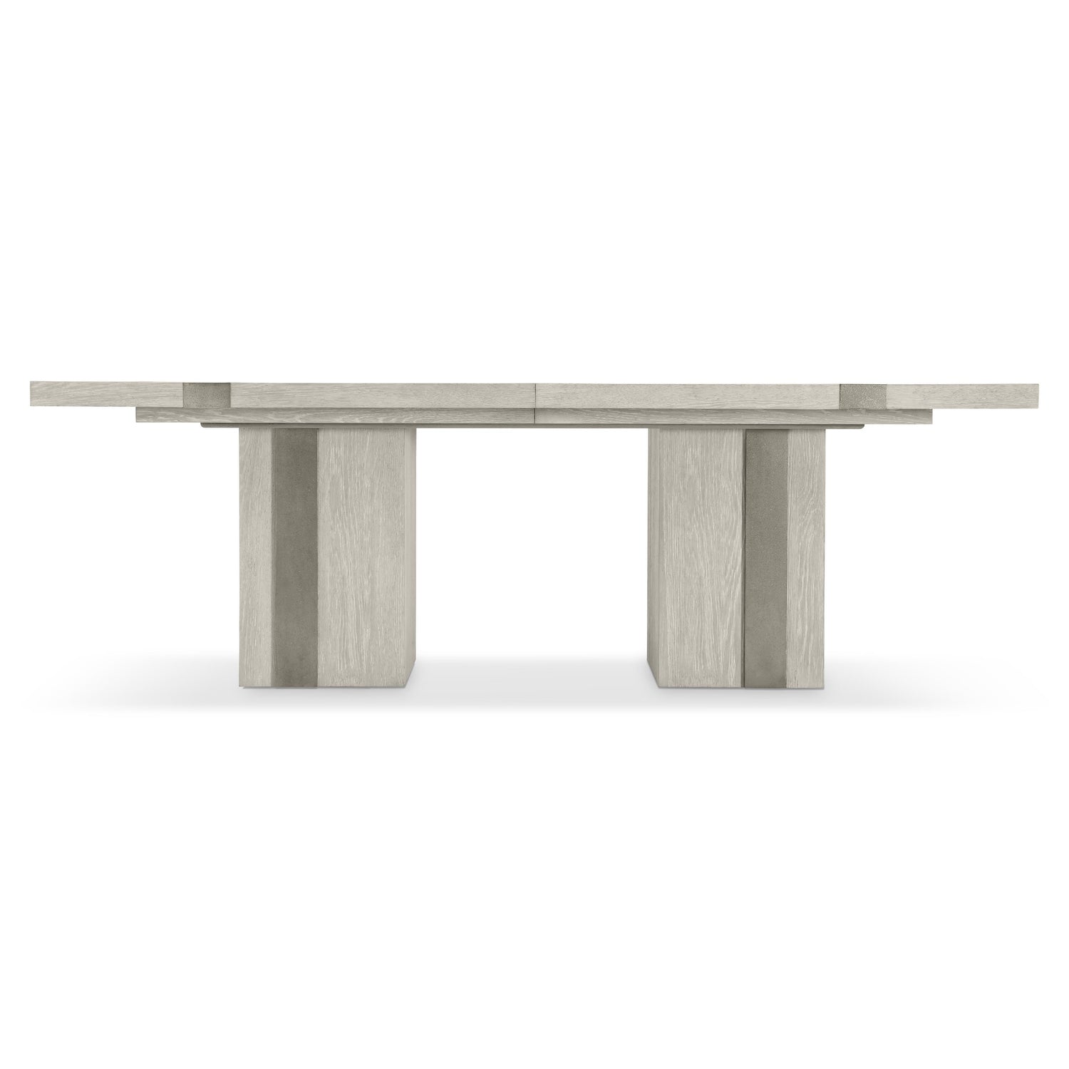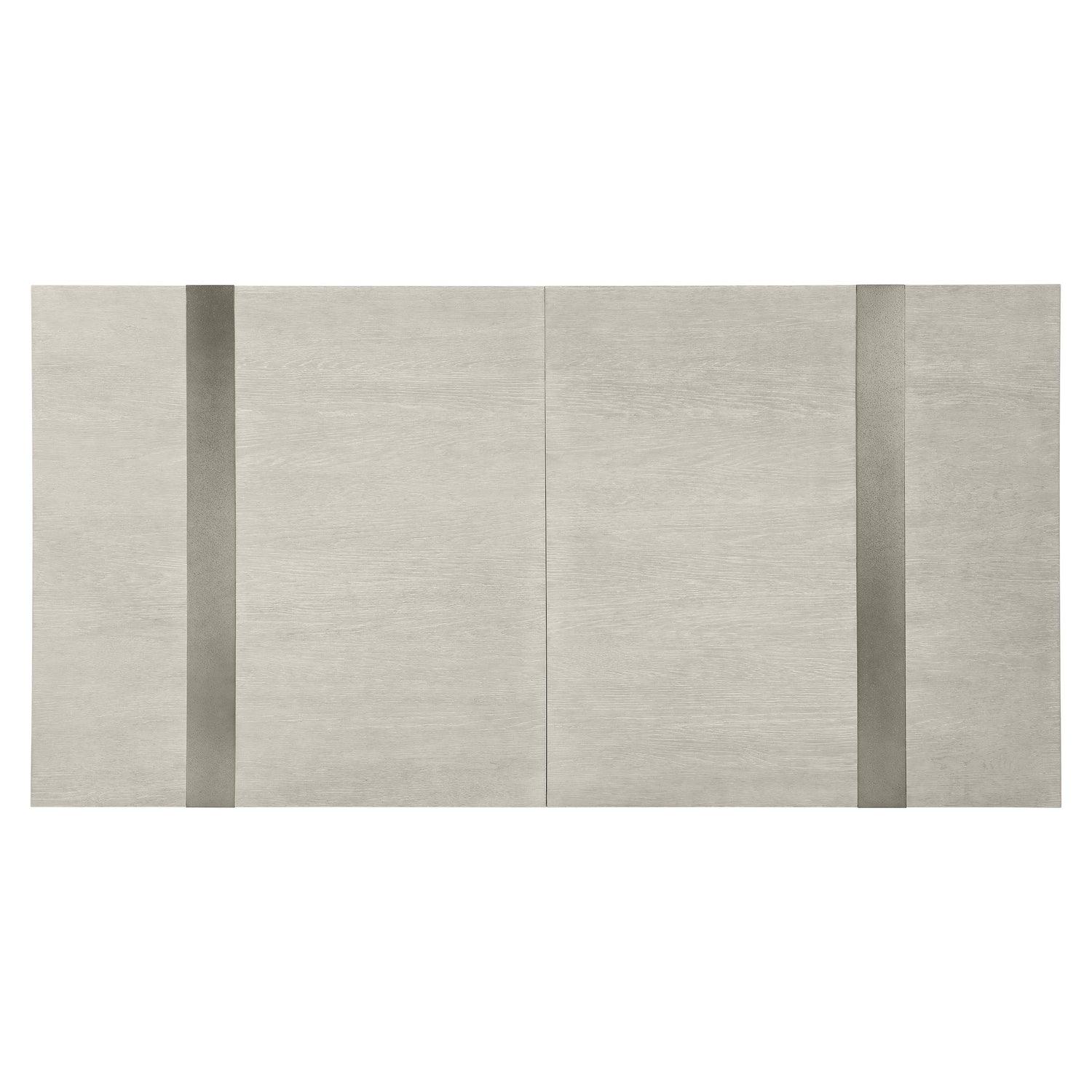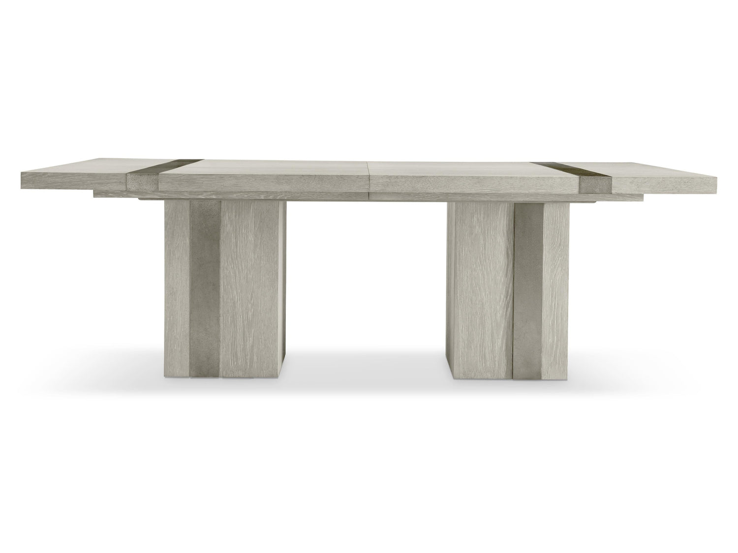 - Wirebrushed oak top and double-pedestal base in Larza finish with sandblasted aluminum overlays on both in Satin Nickel finish